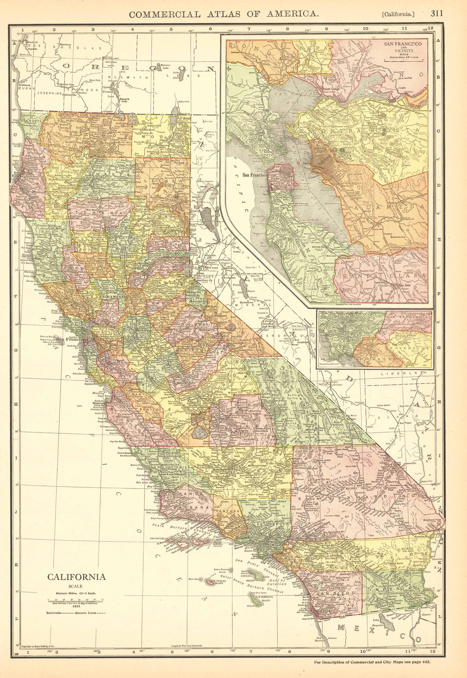 This map of California was produced by Rand McNally and Co. as part of its Commercial Atlas of America. These maps are some of our favorite maps because of the large size of each map (25.5 x 20.5). The detail shown on each map is exceptional because of the map size. These maps were intended to be used by business for shipping and other uses. Roads, railroads, rivers, and buildings are clearly shown. There is more detail on these maps than any others during this time period.