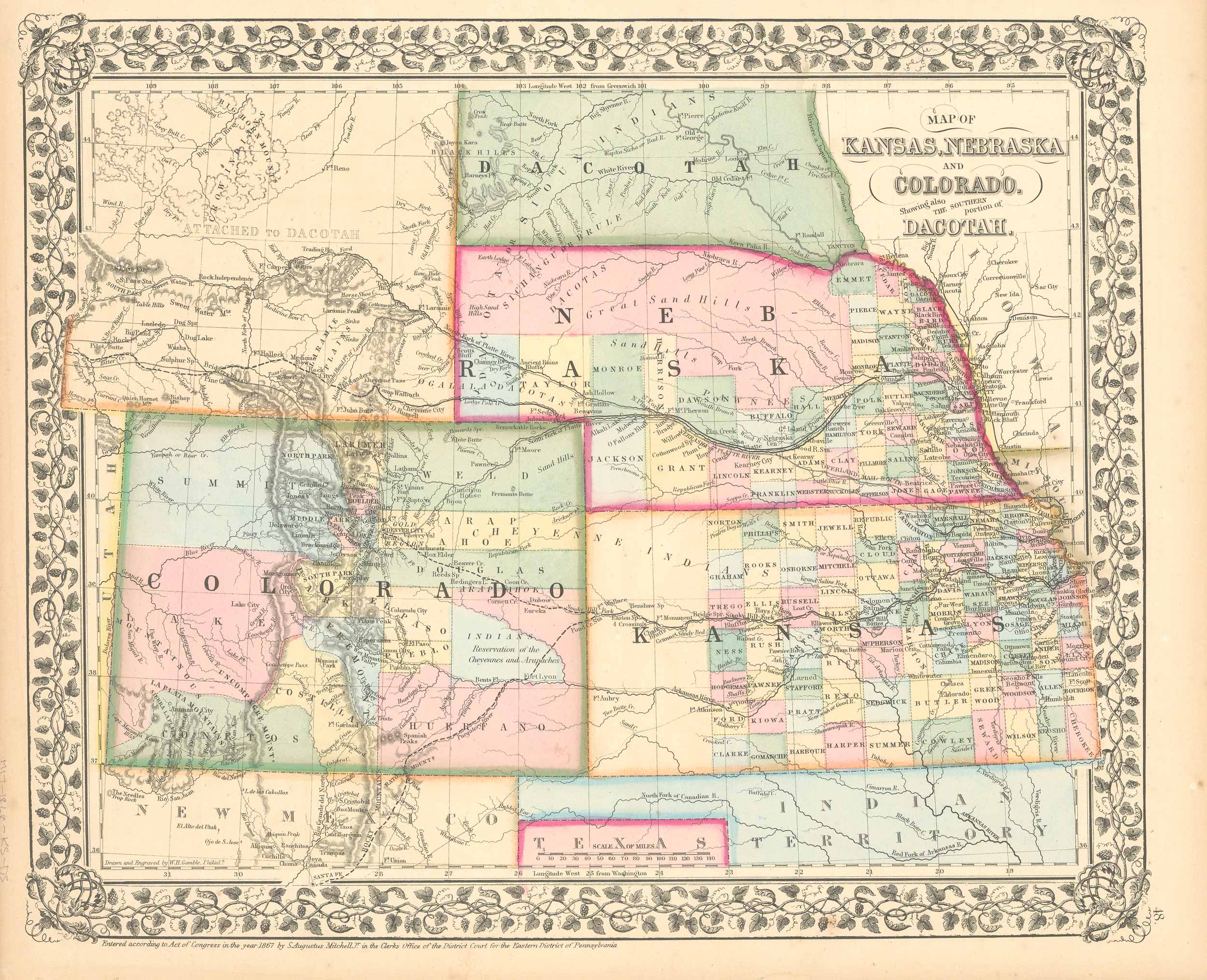 This hand colored map was made for “Mitchells New General Atlas” published by S. Augustus Mitchell, Jr. in 1868. Kansas, Nebraska, Colorado, and the southern part of Dakota are illustrated on this map. Counties are distinguished by color. Other details include the names of states, counties, and important cities, native american tribes and their territory, rivers, lakes, mountains, and railroads. The maps in this atlas have beautiful color- more muted than typical.