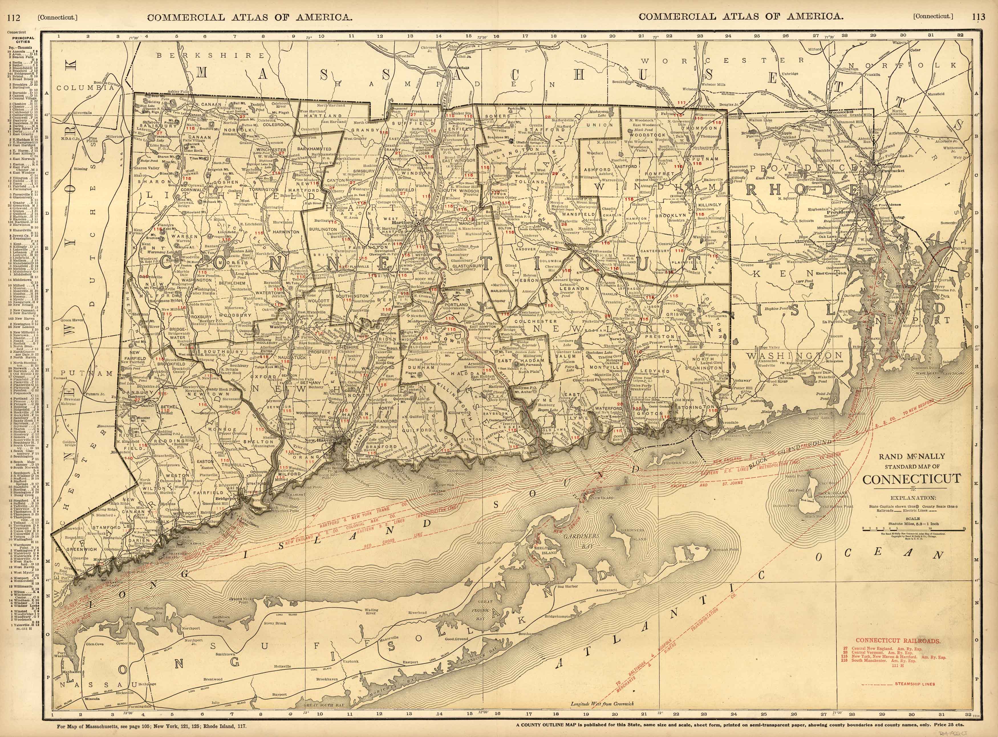 This map of Connecticut was produced by Rand McNally and Co. as part of its Commercial Atlas of America. The detail shown on each map is exceptional because of the map size. These maps were intended to be used by business for shipping, etc. Roads, railroads, and rivers are clearly shown. There is more detail on these maps than any others during this time period.