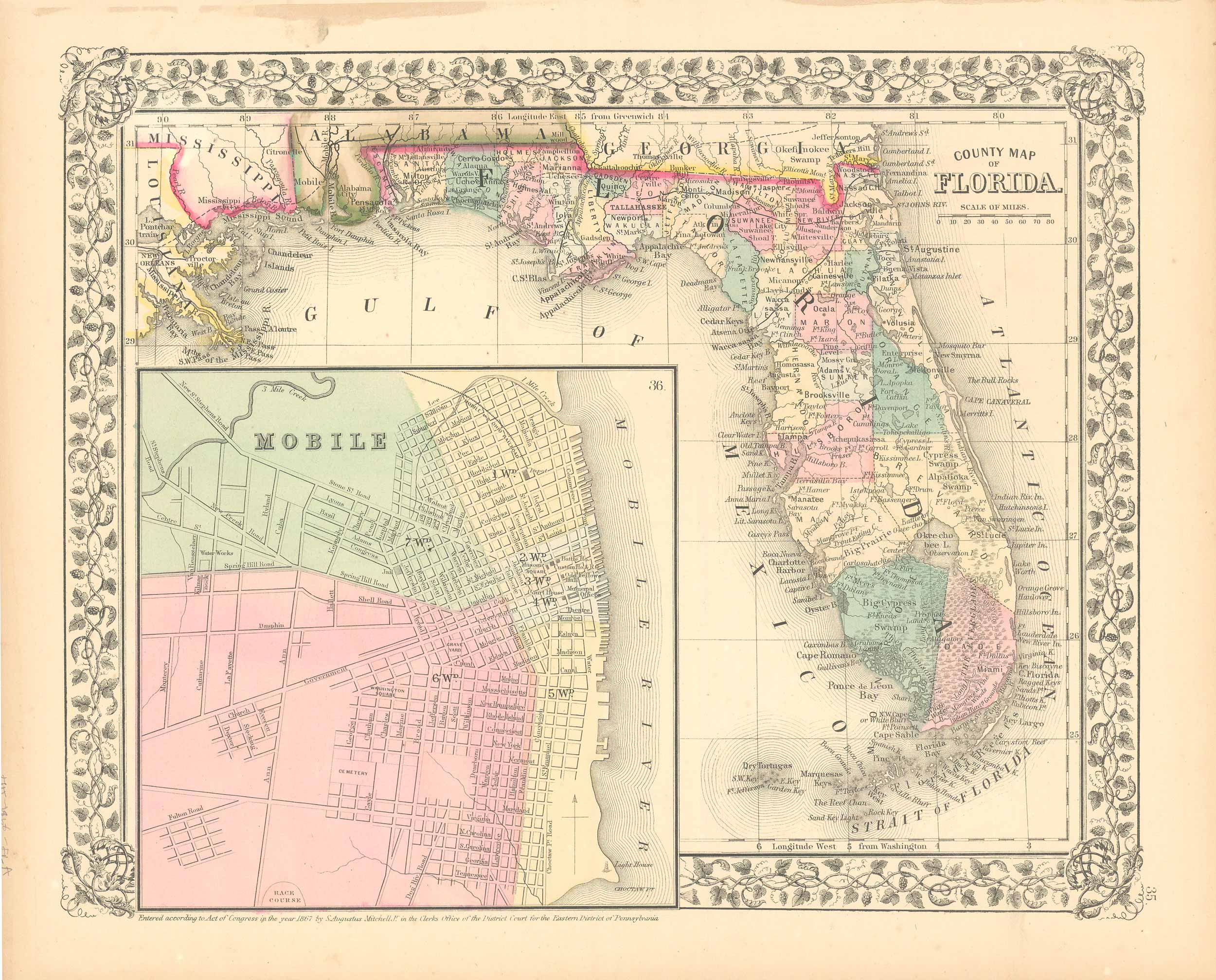 This hand colored map was made for “Mitchells New General Atlas” published by S. Augustus Mitchell, Jr. in 1868. Florida is illustrated on this map. An inset shows the plan of Mobile at a greater scale than the main map. Counties are distinguished by color. Other details include the names of states, counties, and important cities, rivers, lakes, mountains, and railroads. The maps in this atlas have beautiful color- more muted than typical.