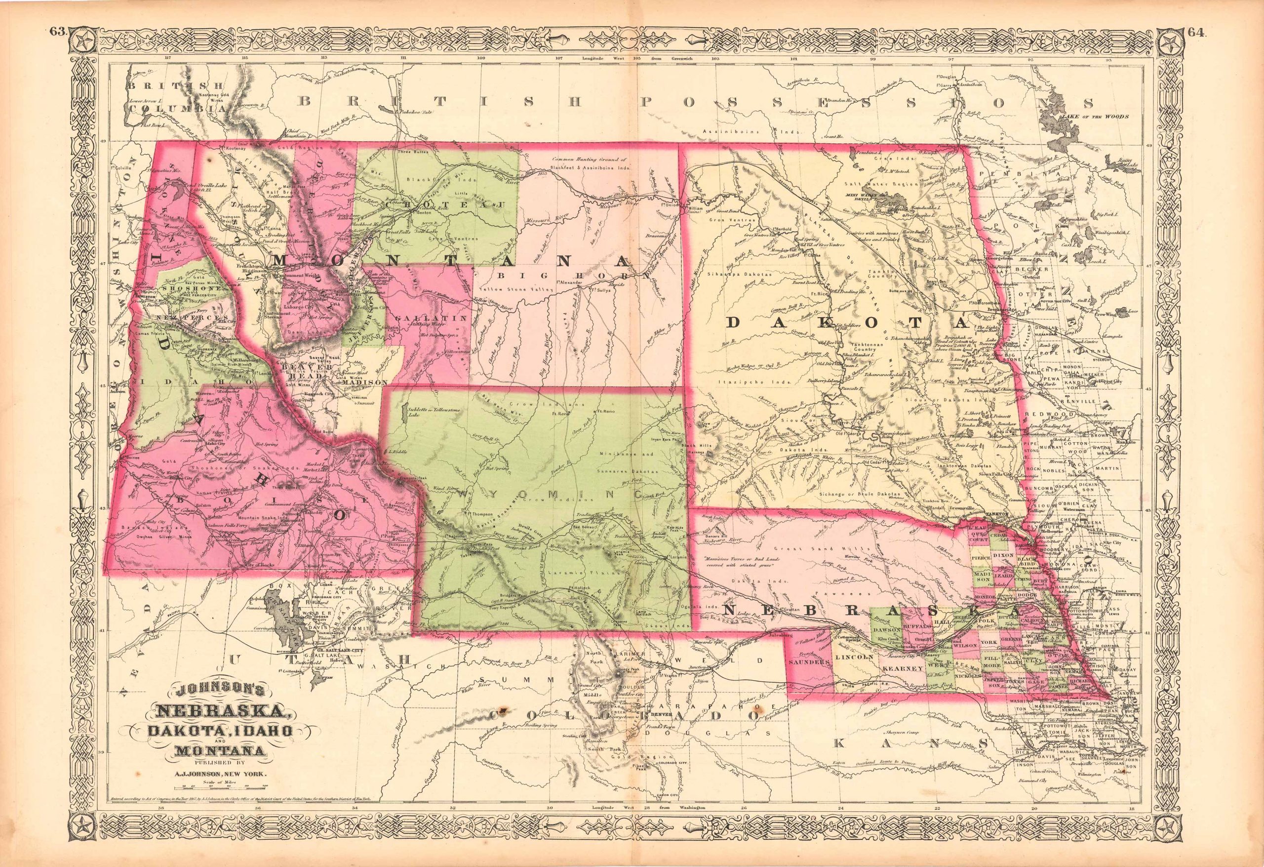 This antique map came from Johnson’s New Illustrated (Steel Plate) Family Atlas, published in 1867, by A.J. Johnson. These maps are some of the most colorful and accurate maps produced in the 1860’s, their attention to detail and the fine steel engraving make them works of art. Johnson maps are characterized by hand coloring in red, green, yellow, and pink and distinctive borders, including iron scrollwork and a Celtic design. This beautiful map of the States of Nebraska, Dakota, Idaho, and Montana shows counties, cities and towns, lakes, rivers, and water bodies, railroads, forts, and wagon trails. A fine piece that would make a nice addition to any wall in a home or office. While there are many notable qualities to this map, some are more pronounced than others. The western border of Wyoming has a unique “dog-leg” addition that spreads into Montana, which stands out immediately. Upon inspection we begin to notice the numerous Forts, wagon roads, explorers routes, as well as the Pony Express route. Many Indian tribes are noted.