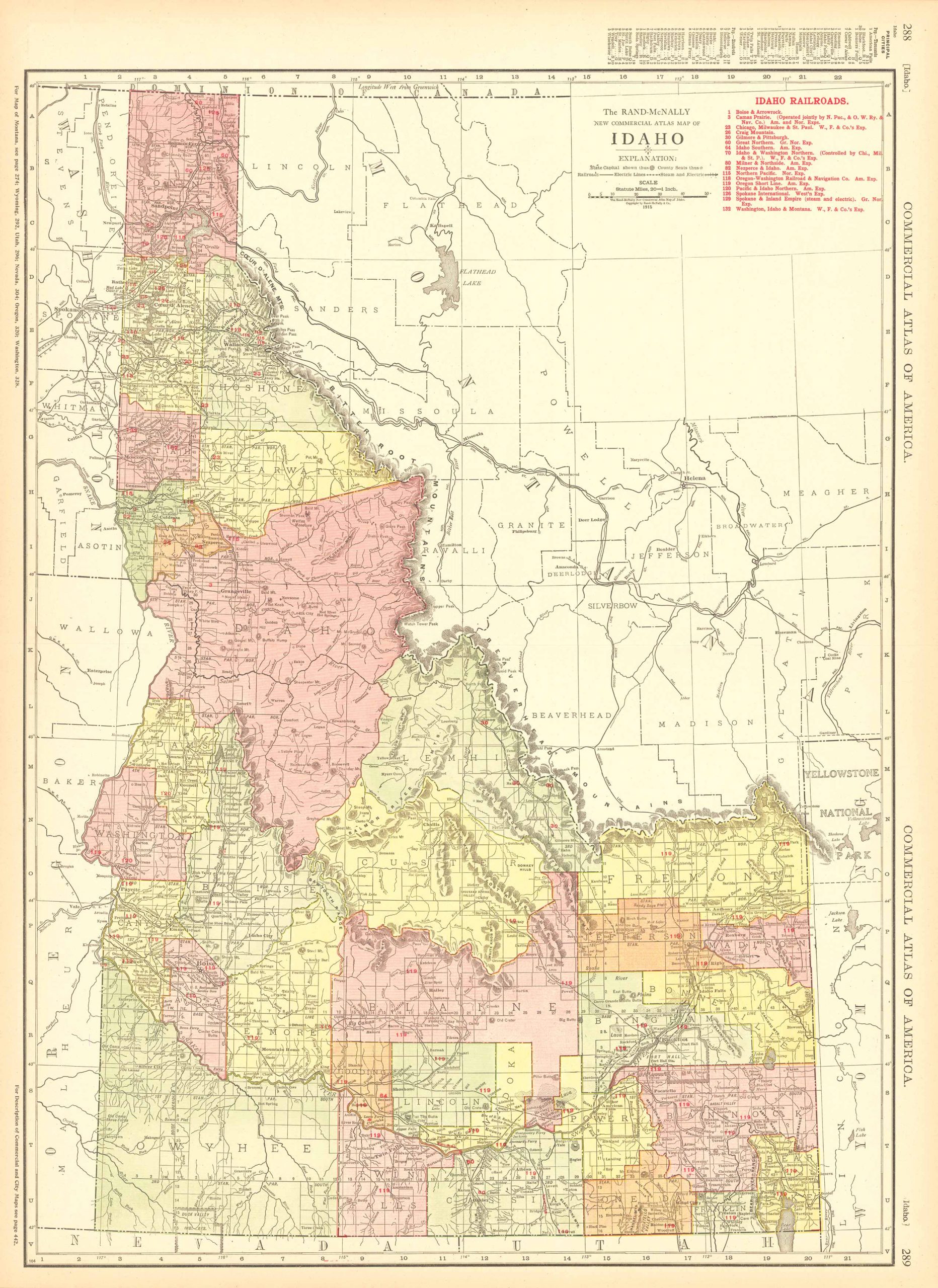This map of Idaho was produced by Rand McNally and Co. as part of its Commercial Atlas of America. These maps are some of our favorite maps because of the large size of each map. The detail shown on each map is exceptional because of the map size. These maps were intended to be used by business for shipping and other uses. Roads, railroads, rivers, and buildings are clearly shown. There is more detail on these maps than any others during this time period.