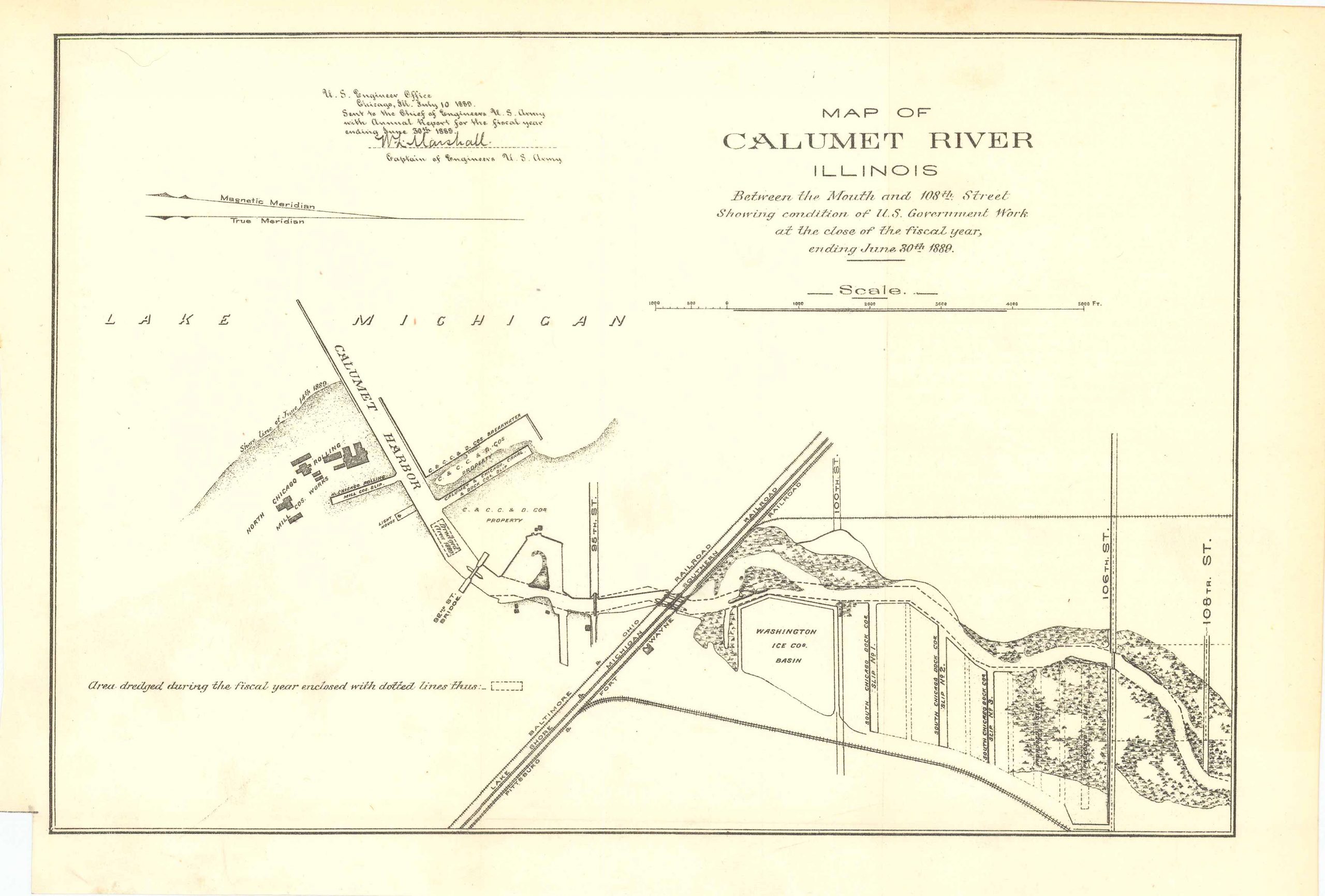 This is a Map of Calumet River, Illinois, between the Mouth and 108th street showing condition of U.S. government work at the close of the fiscal year ending June 30th, 1889. Drawn up by the U.S. Engineer Office Chicago, IL. July 10, 1889. Sent to the chief of engineers, W.L. Marshall. This map features true and magnetic meridian lines, Lake Michigan, Calumet Harbor, and various natural and man-made features such as the Baltimore and Ohio Railroad.
