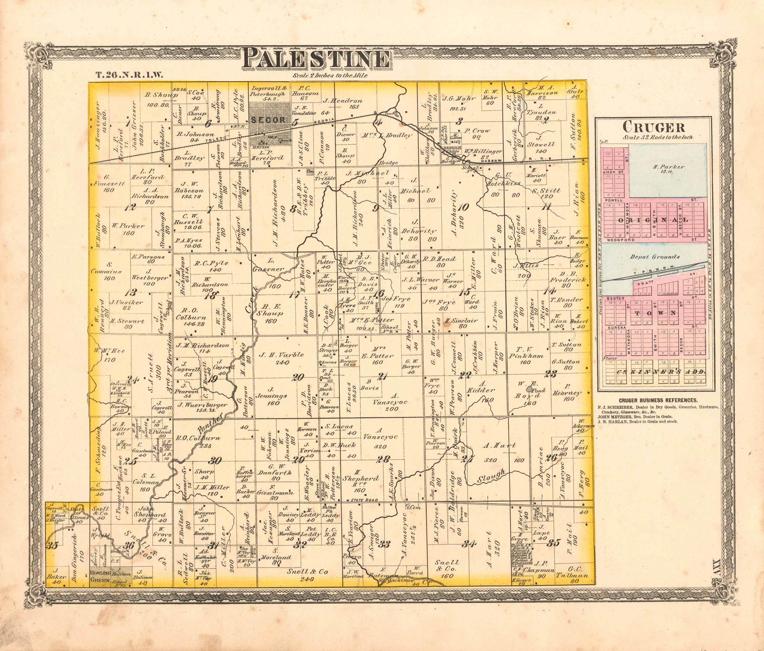 In 1873, Warner and Beers published the “Atlas of Woodford County and the State of Illinois to which is added an atlas of the United States and maps of the Hemisphere’s”. Warner and Beers were the pre-eminent publishers of State and County atlas’ during this time. As a marketing tool they would publish a specific county section as part of the state atlas. Included in this atlas were maps of all towns in Woodford County. These maps are recognized for their fine engraving work and beautiful, rich hand-coloring.