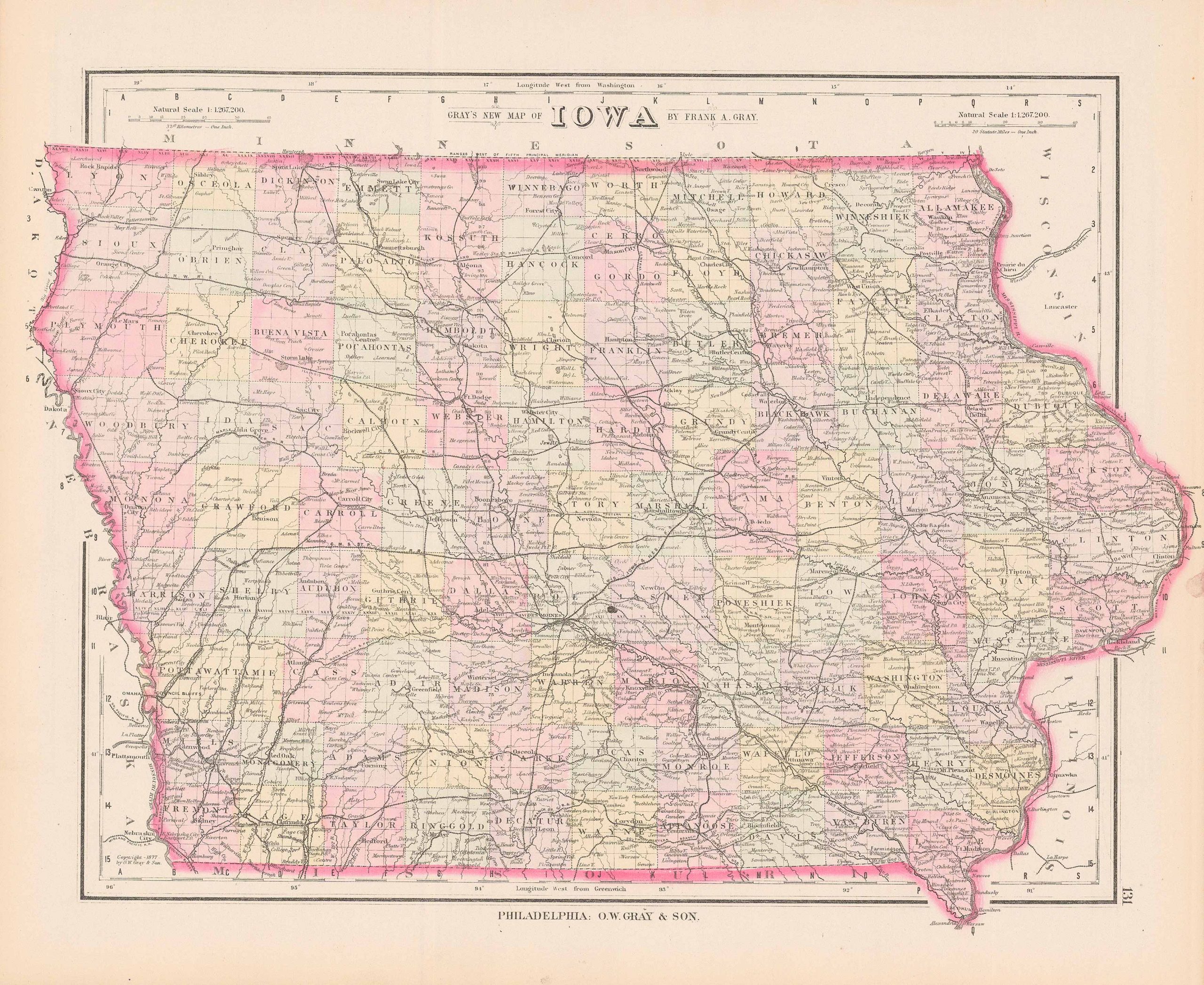 This antique map of Iowa was produced by O.W. Gray as part of his “National Atlas” in 1884. Gray was involved in the production of Atlas’ from ca. 1871 – 1886. We love his maps because of the wonderful hand coloring and attention to detail.