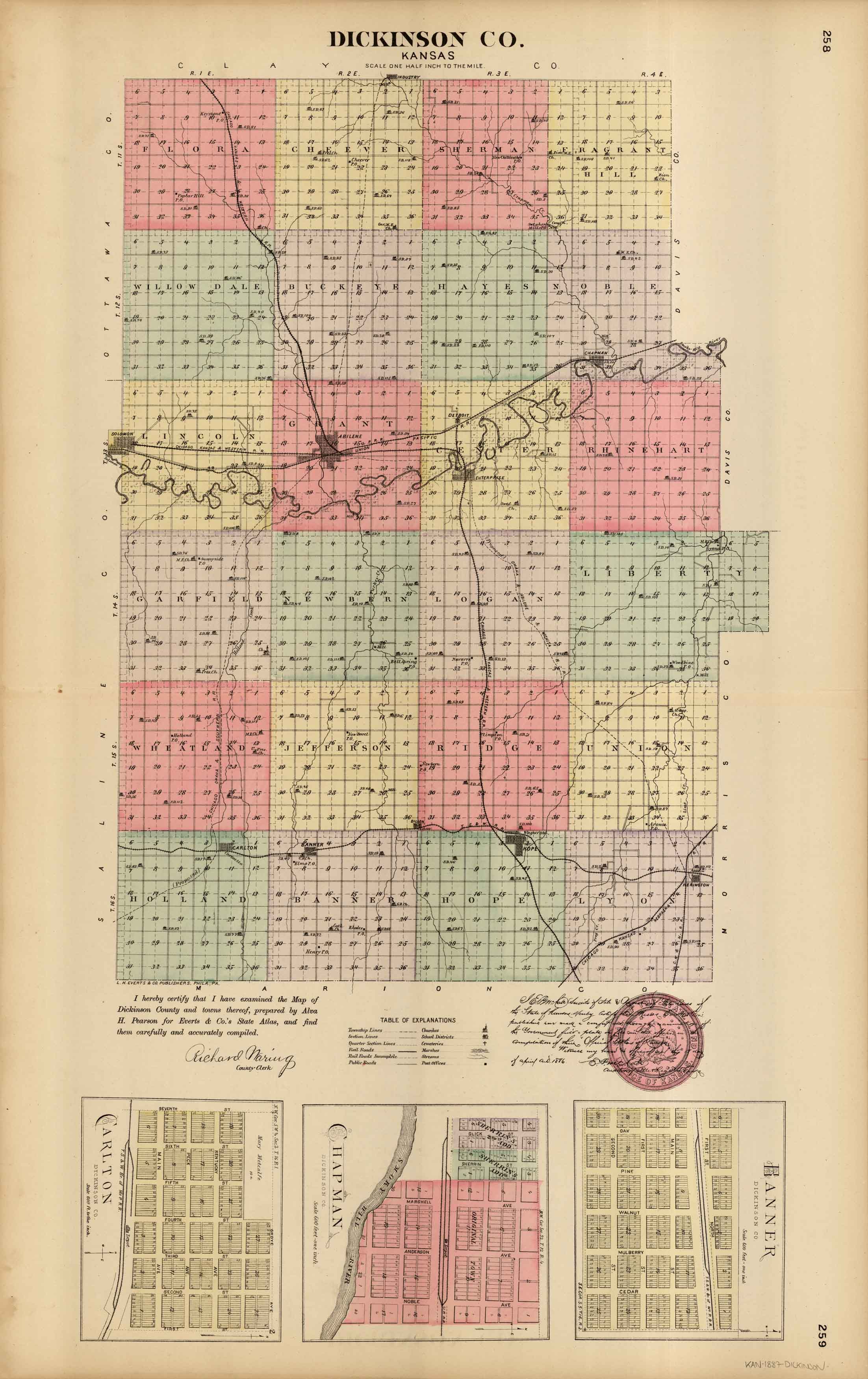 L.H. Evert’s 1887 Map of Dickinson County, Banner, Chapman, and Carlton, Kansas