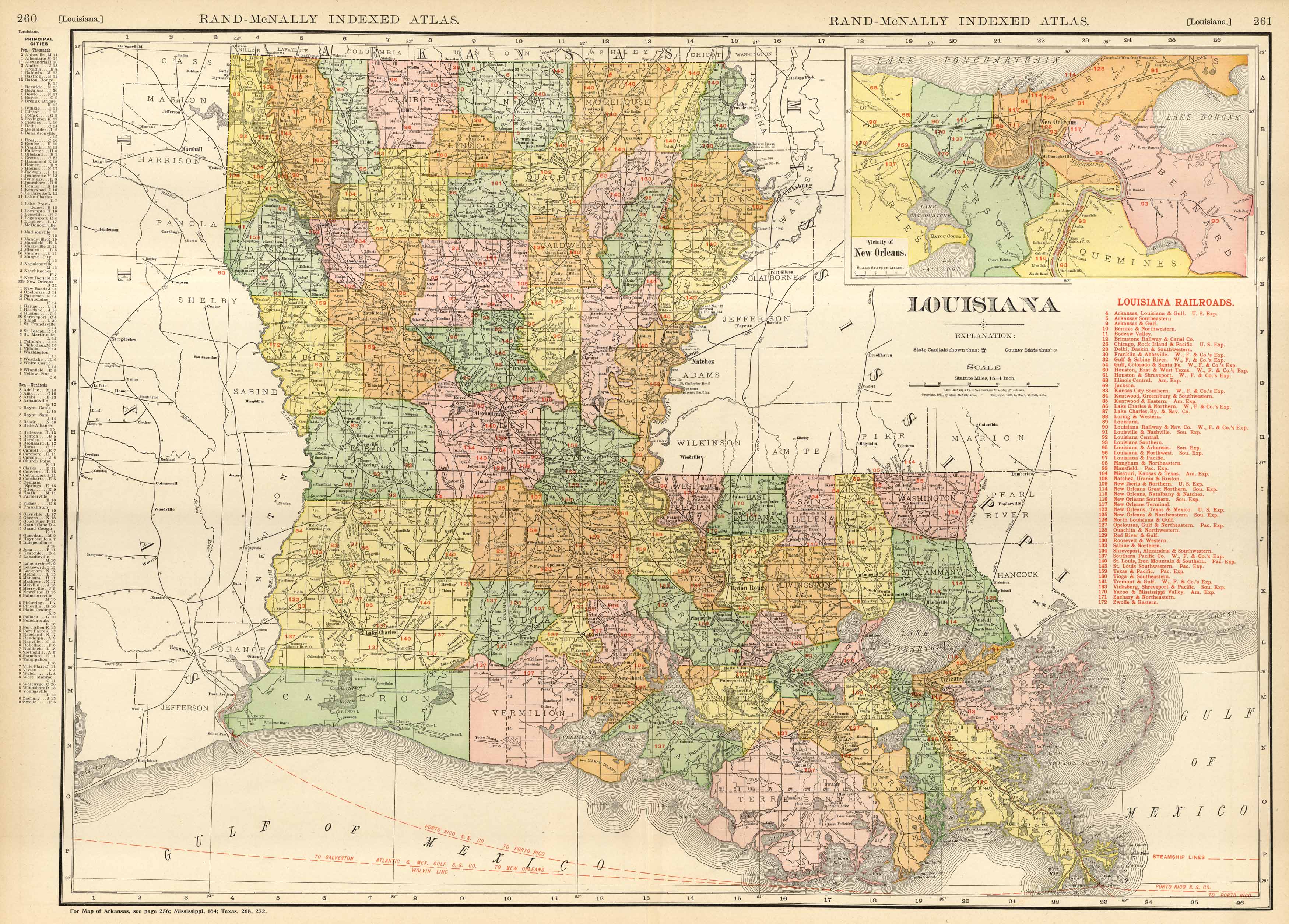 This map of Louisiana was produced by Rand McNally and Co. as part of its Commercial Atlas of America. These maps are some of our favorite maps because of the large size of each map sheet (25.5”x20.5”). The detail shown on each map is exceptional because of the map size. These maps were intended to be used by business for shipping and other uses. Roads, railroads, and rivers are clearly shown. There is more detail on these maps than any others during this time period.