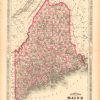 This antique map came from Johnsons New Illustrated (Steel Plate) Family Atlas, published in 1867, by A.J. Johnson. These maps are some of the most colorful and accurate maps produced in the 1860’s, their attention to detail and the fine steel engraving make them works of art. Johnson maps are characterized by hand coloring in red, green, yellow, and pink and distinctive borders, including iron scrollwork and a Celtic design. This beautiful map of the State of Maine shows counties, cities and towns, lakes, rivers, and water bodies, railroads, forts, and wagon trails. A fine piece that would make a nice addition to any wall in a home or office.
