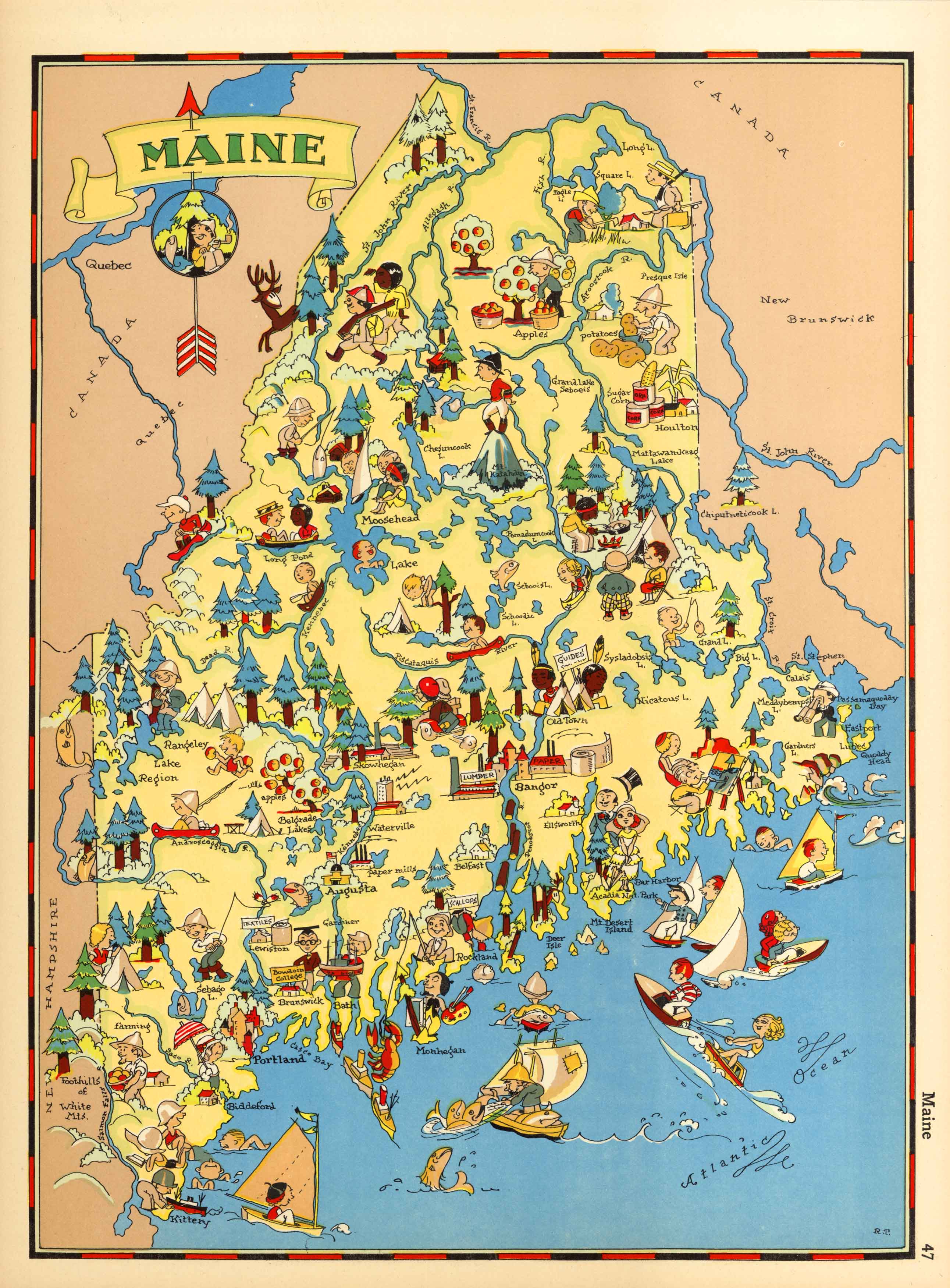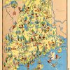 This charming antique pictorial map was published in 1935 by the famous mapmaker & illustrator, Ruth Taylor (White). These illustrated maps came from the atlas, “Our U.S.A – A Gay Geography,” with text by Frank Taylor & the maps done by Ruth Taylor. Ruth Taylors maps have become increasingly rare. Her whimsical maps are bold, colorful, and full of life; showing the local feel, cultural stereotypes, industries and activities of the area. These maps have become very difficult to find and would be a great addition to any map collection.