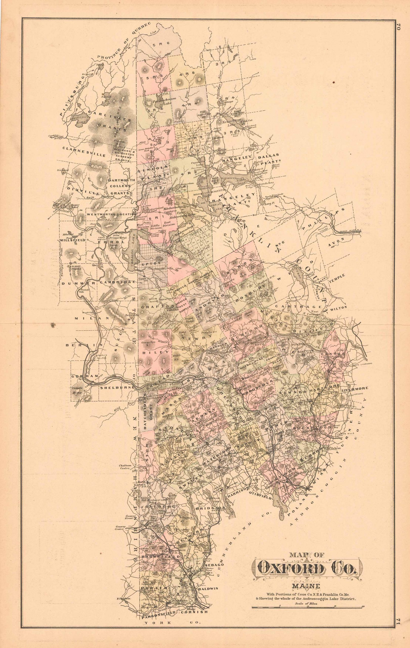 This beautiful, original hand-colored map of Oxford County came from the “Atlas of the State of Maine” produced by George N. Colby & Co. in 1884. Colbys atlas and the maps therein were produced in limited numbers for a short time, making city and county maps of Maine difficult to locate. This detailed mapg shows cities and towns, Post Offices, lakes, rivers and coastal features, proposed and completed railroads, wagon roads, topographical features, and mills.
