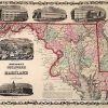 Johnson and Browning produced this steel plate, hand colored map for “Johnsons New Illustrated Family Atlas” in 1862. Delaware and Maryland are illustrated on this detailed map. Counties are distinguished by bright pastel colors. Other details include lakes, rivers, railroads, and the names of states, counties, ad important cities.