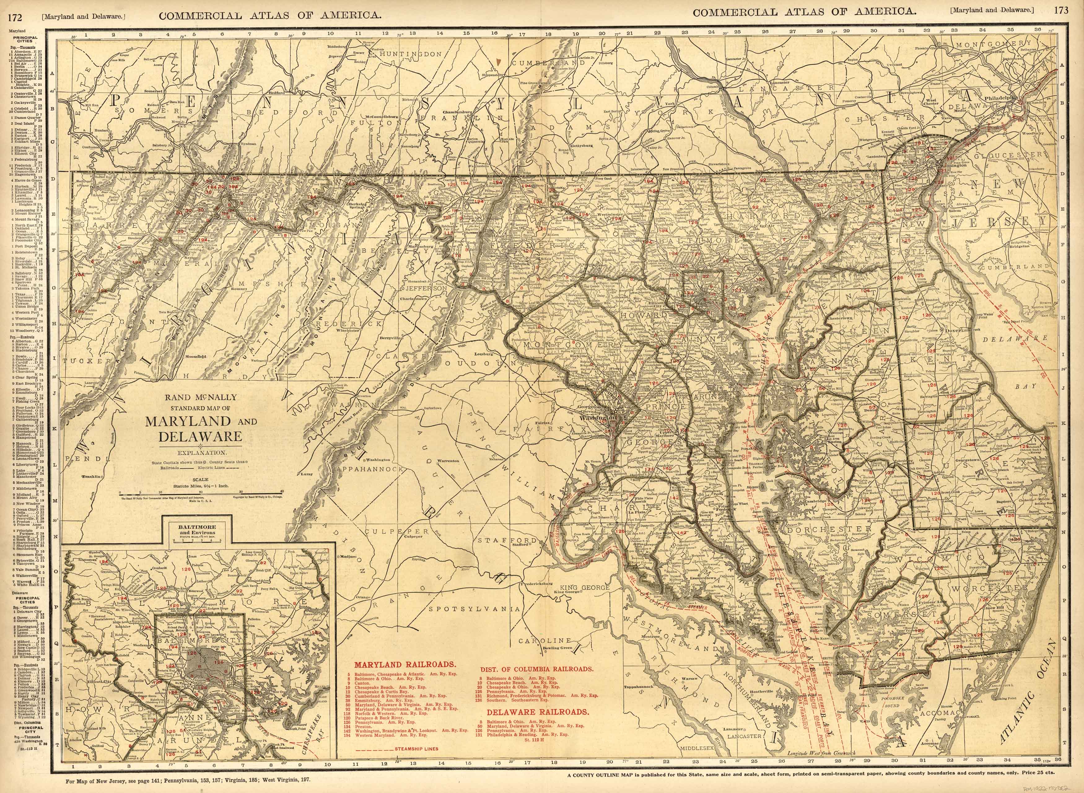 This map of Maryland and Delaware was produced by Rand McNally and Co. as part of its Commercial Atlas of America. The detail shown on each map is exceptional because of the map size. These maps were intended to be used by business for shipping, etc. Roads, railroads, and rivers are clearly shown. There is more detail on these maps than any others during this time period.