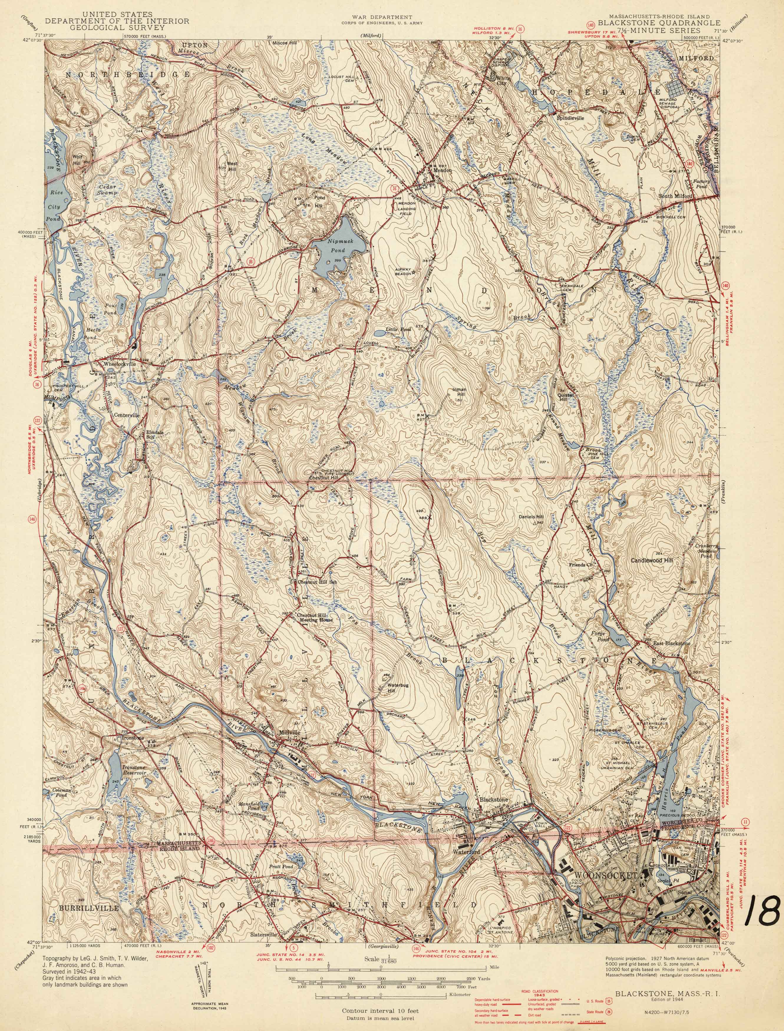 U.S. Geologic Survey 1944 Map of Blackstone, Massachusetts