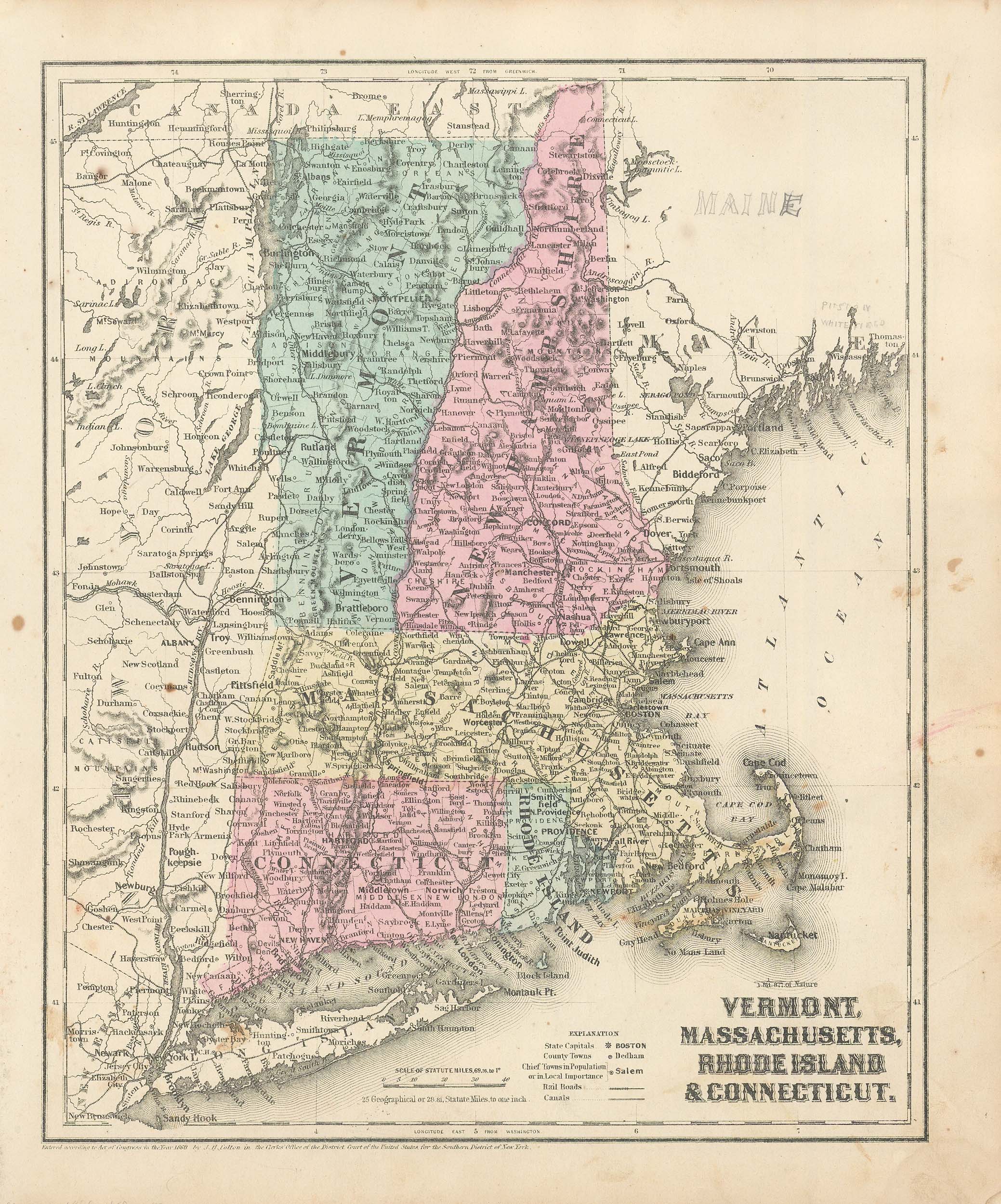 Colton’s 1860 Map of Vermont, Massachusetts, Rhode Island, and Connecticut