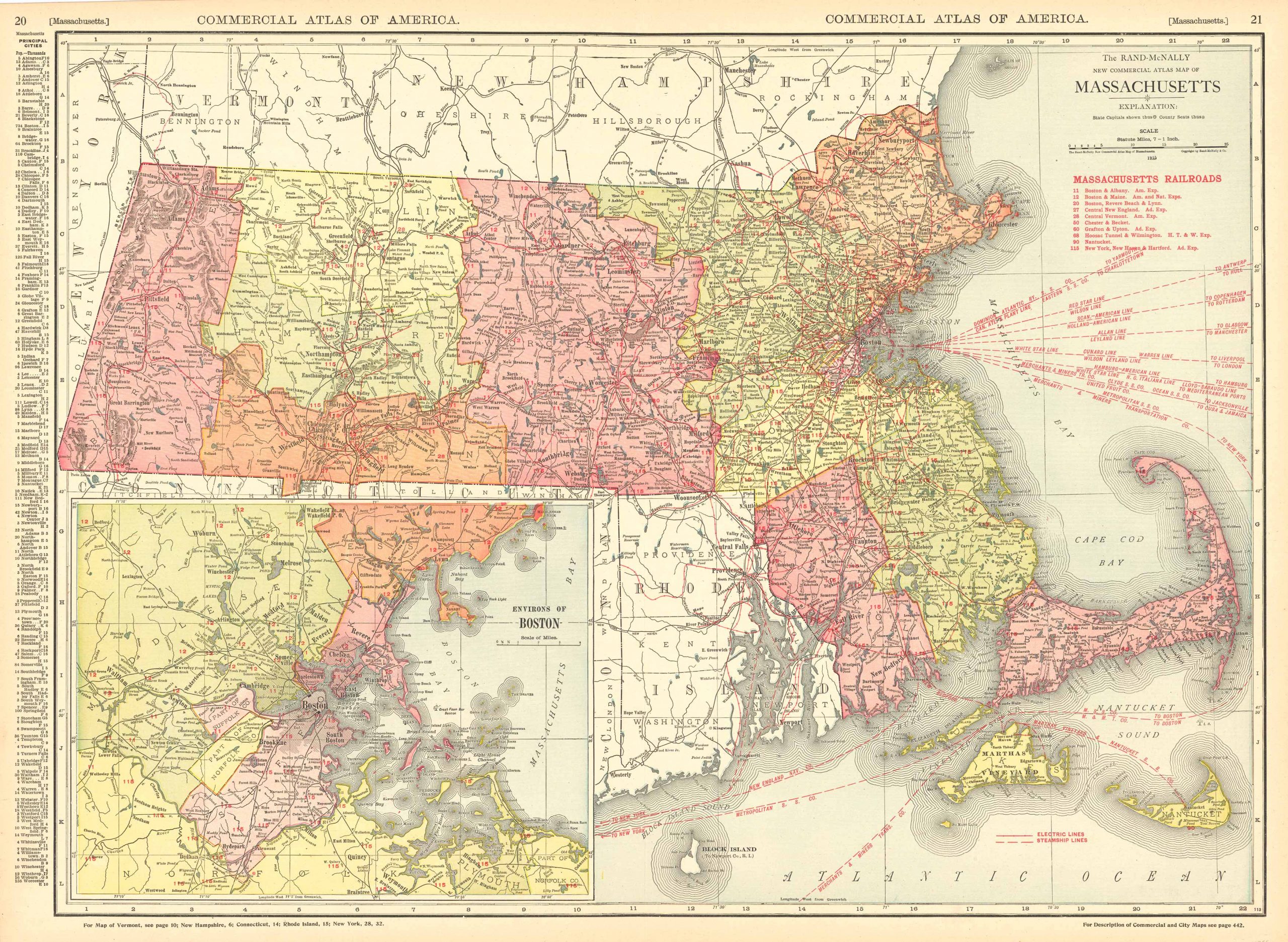 This map of Massachusetts was produced by Rand McNally and Co. as part of its Commercial Atlas of America. These maps are some of our favorite maps because of the large size of each map. The detail shown on each map is exceptional because of the map size. These maps were intended to be used by business for shipping and other uses. Roads, railroads, rivers, and buildings are clearly shown. There is more detail on these maps than any others during this time period.