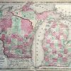 This antique map came from Johnson’s New Illustrated (Steel Plate) Family Atlas, published in 1863, by Johnson and Ward. These maps are some of the most colorful and accurate maps produced in the 1860’s. Johnson maps are characterized by hand coloring in red and green and distinctive borders, including iron scrollwork and a Celtic design. This beautiful double page state map includes the cities and counties of Michigan and Wisconsin.