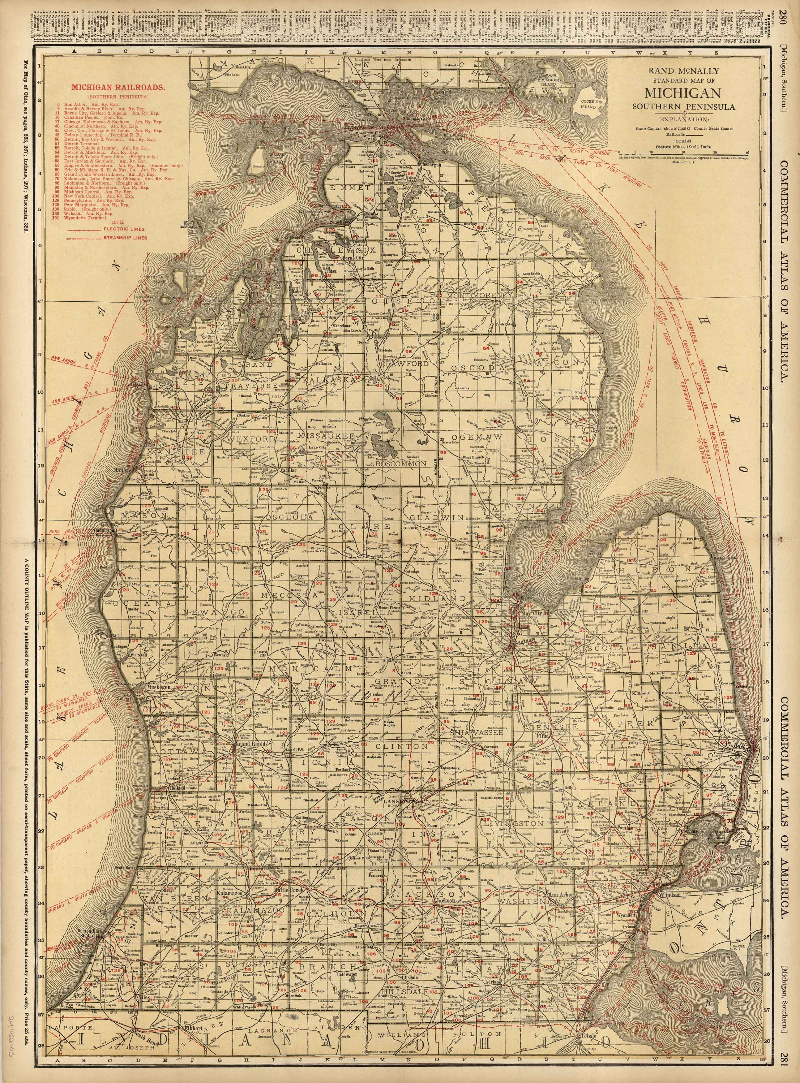 This map of Michigan was produced by Rand McNally and Co. as part of its Commercial Atlas of America. The detail shown on each map is exceptional because of the map size. These maps were intended to be used by business for shipping, etc. Roads, railroads, and rivers are clearly shown. There is more detail on these maps than any others during this time period.
