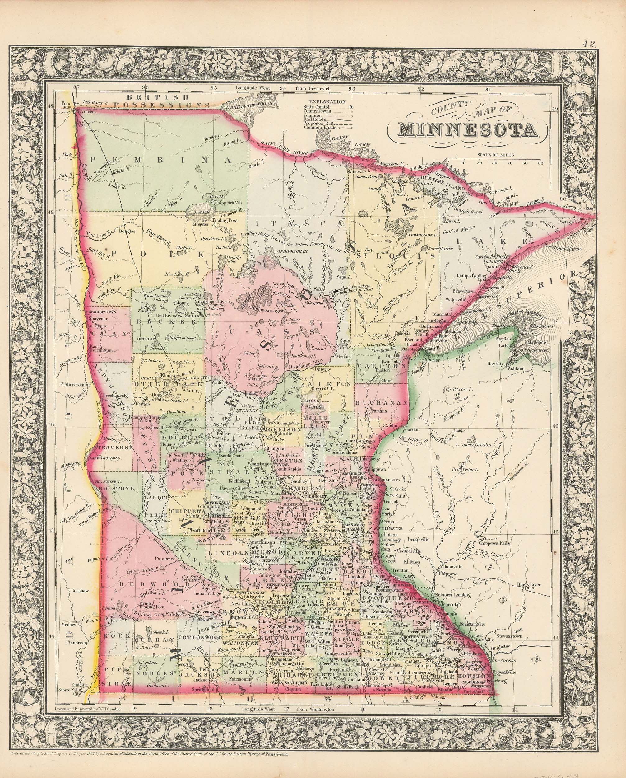 In 1860 S. Augustus Mitchell Jr. took over his father’s map publishing business and in that year he started publishing Mitchell’s New General Atlas. Editions of the new general were issued annually until 1887. Mitchell Jr. continued publishing this atlas until 1879. The editions from 1880 to 1887 were published by Wm. M. Bradley. This map published in 1865 is a wonderful example of Mitchell’s map-making prowess with beautiful original hand-coloring.