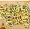 This charming antique pictorial map was published in 1935 by the famous mapmaker & illustrator, Ruth Taylor (White). These illustrated maps came from the atlas, “Our U.S.A – A Gay Geography,” with text by Frank Taylor & the maps done by Ruth Taylor. Ruth Taylors maps have become increasingly rare. Her whimsical maps are bold, colorful, and full of life; showing the local feel, cultural stereotypes, industries and activities of the area. These maps have become very difficult to find and would be a great addition to any map collection.
