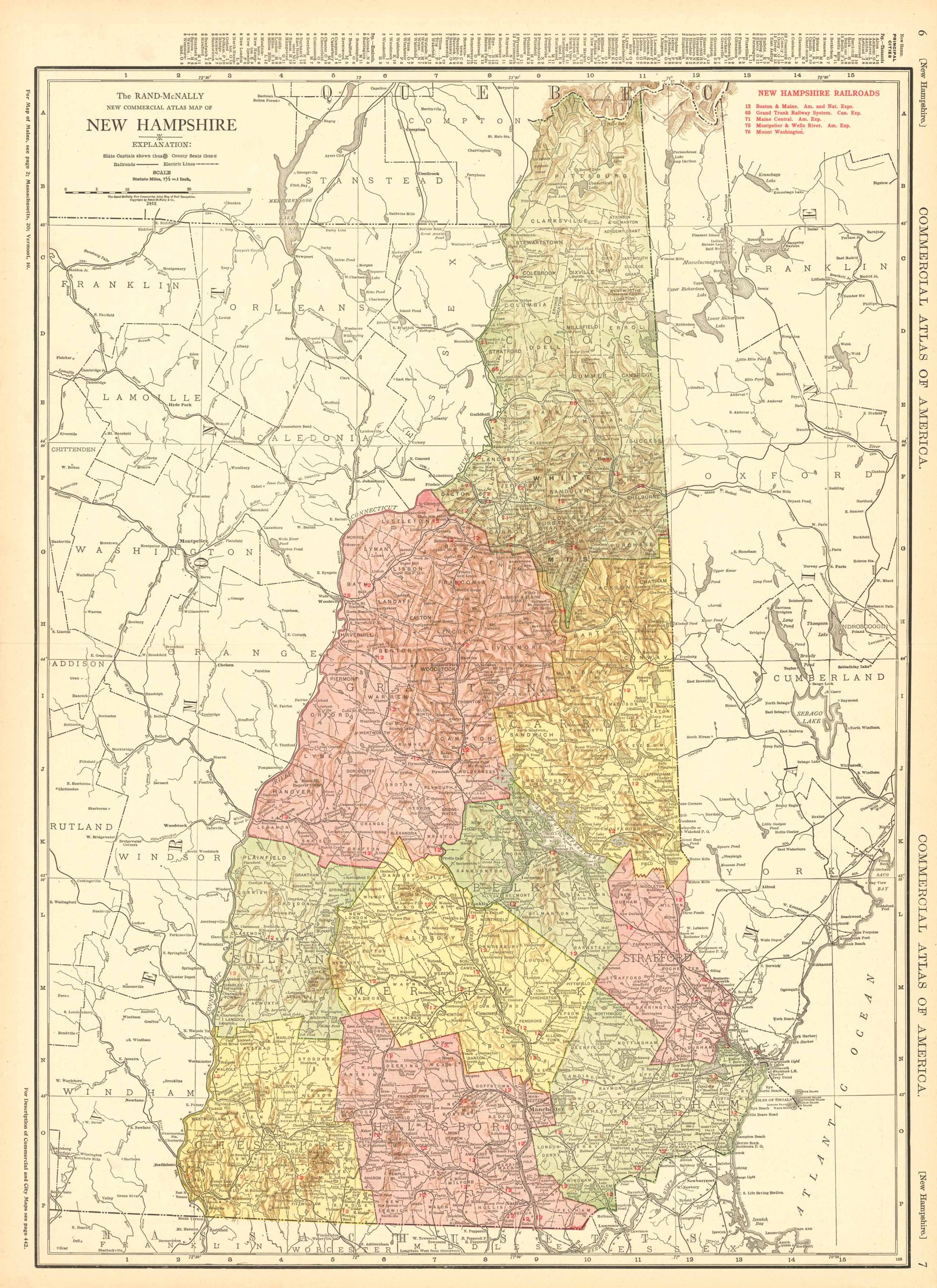 This map of New Hampshire was produced by Rand McNally and Co. as part of its Commercial Atlas of America. These maps are some of our favorite maps because of the large size of each map. The detail shown on each map is exceptional because of the map size. These maps were intended to be used by business for shipping and other uses. Roads, railroads, rivers, and buildings are clearly shown. There is more detail on these maps than any others during this time period.