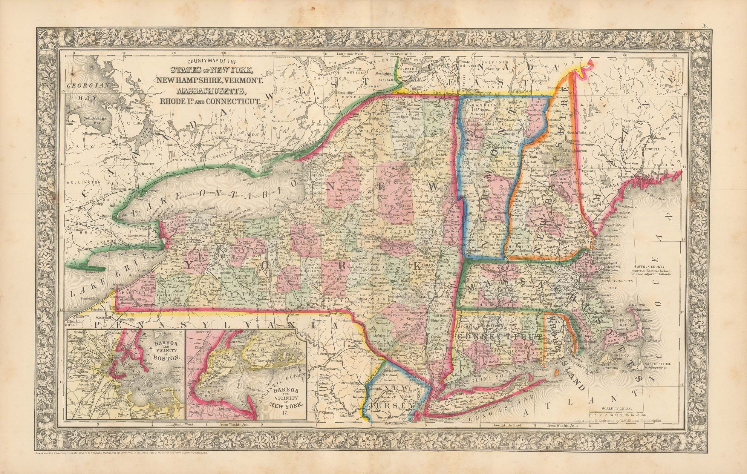 Mitchell’s 1865 County Map of New York, New Hampshire, Vermont, Massachusetts, Rhode Island, and Connecticut