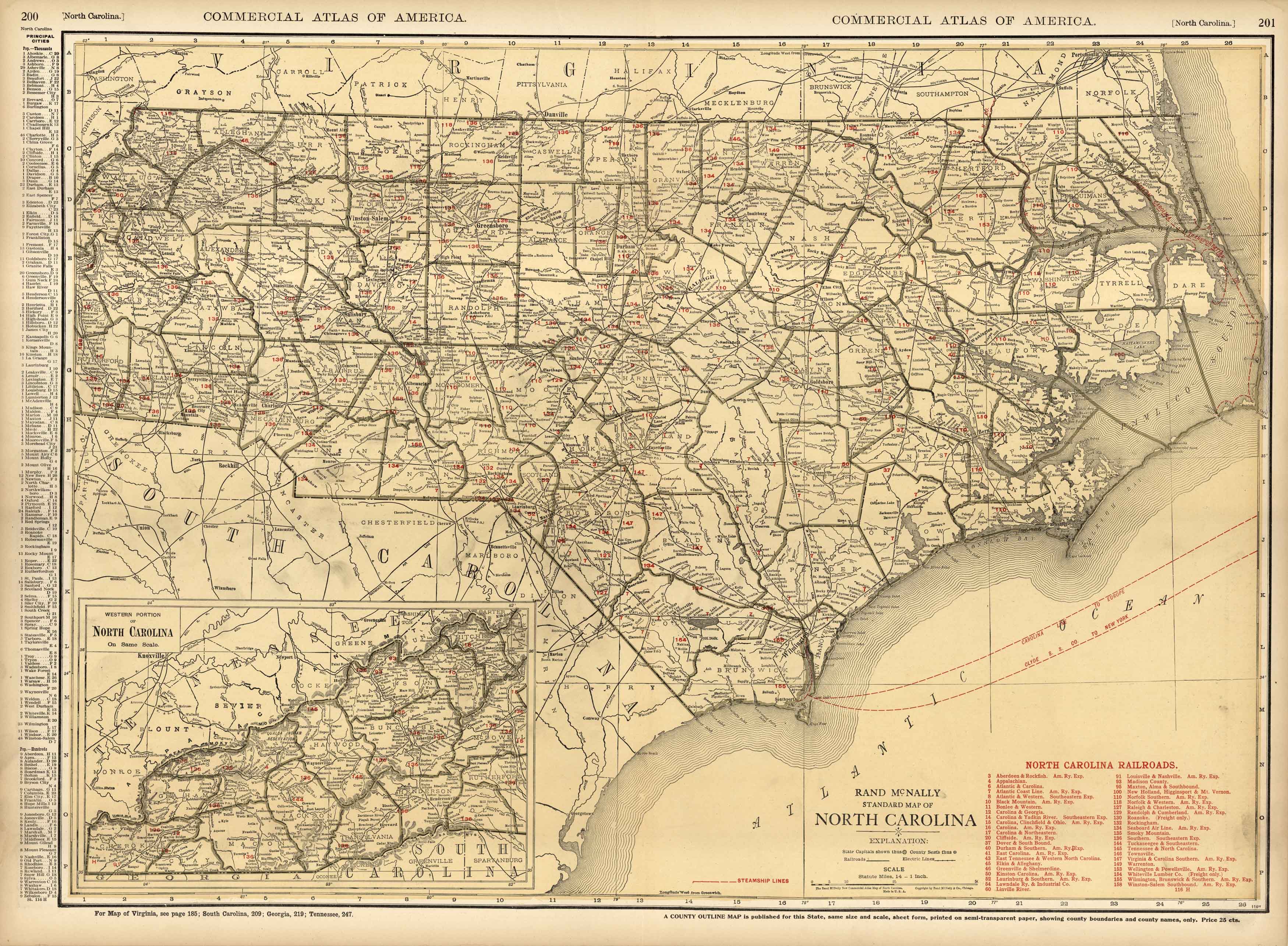 This map of North Carolina was produced by Rand McNally and Co. as part of its Commercial Atlas of America. The detail shown on each map is exceptional because of the map size. These maps were intended to be used by business for shipping, etc. Roads, railroads, and rivers are clearly shown. There is more detail on these maps than any others during this time period.