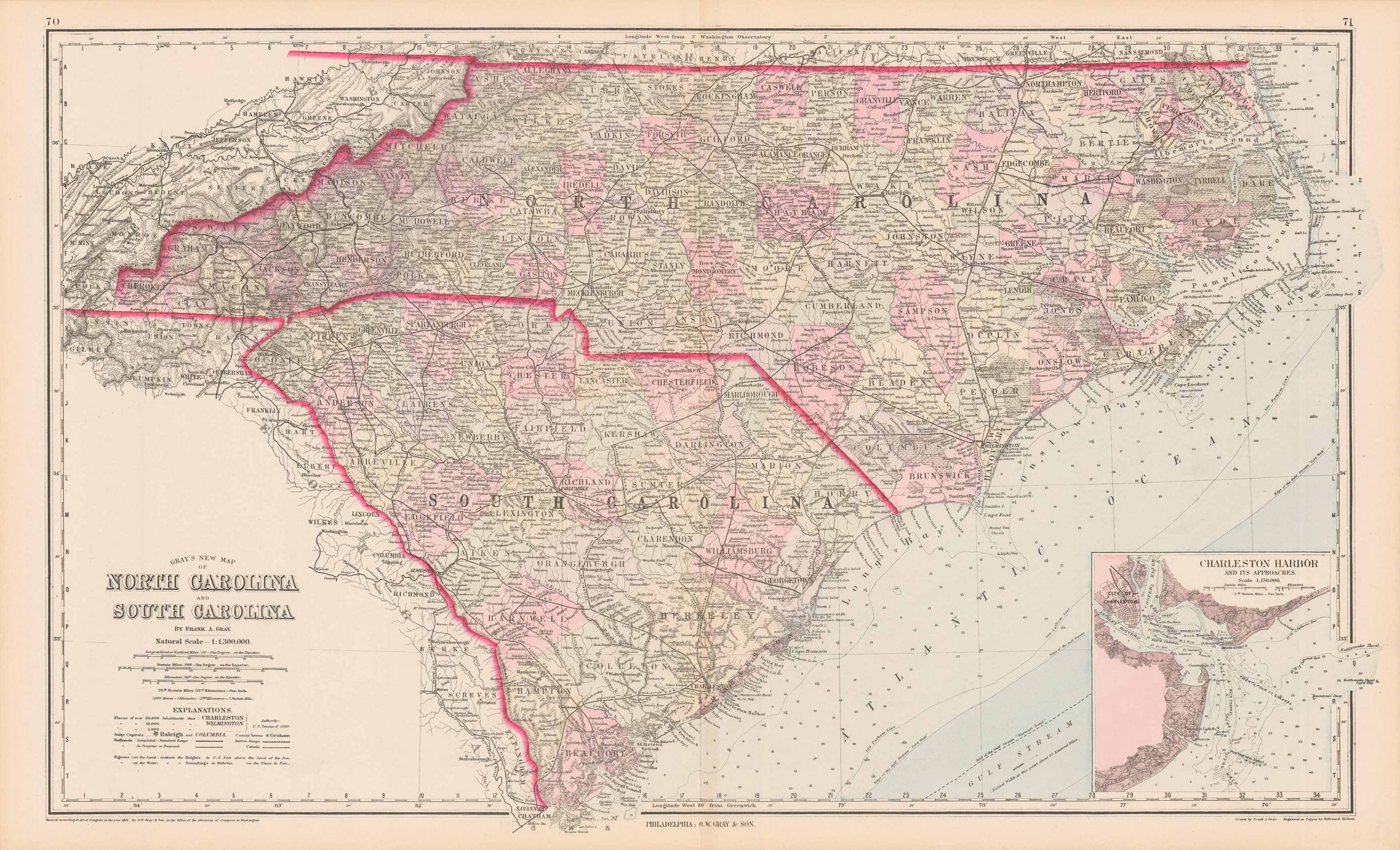 This antique map of North Carolina and South Carolina with an inset of Charleston Harbor was produced by O.W. Gray as part of his “National Atlas” in 1884. Gray was involved in the production of Atlas’ from ca. 1871 – 1886. We love his maps because of the wonderful hand coloring and attention to detail.