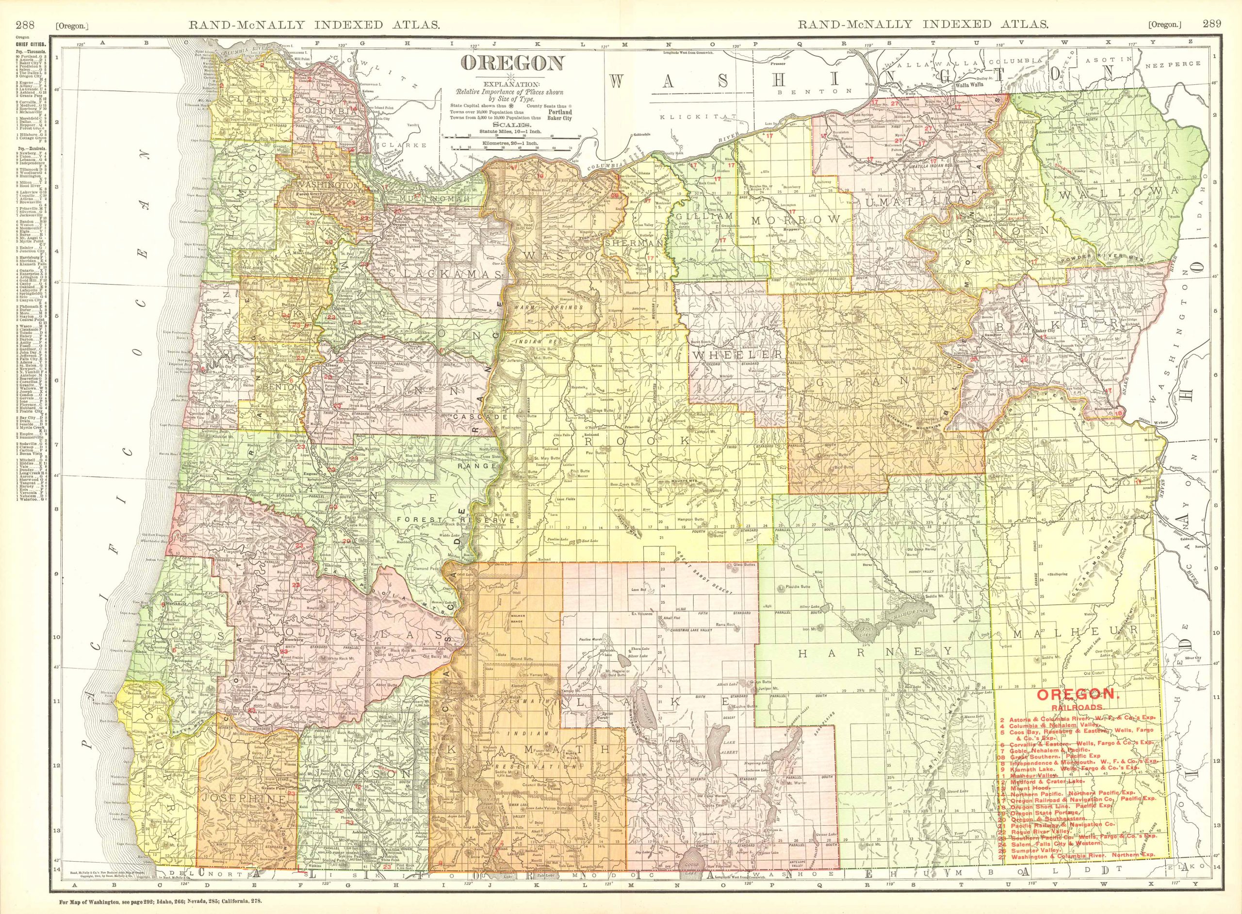 We are proud to offer this wonderful large scale map of Oregon originally issued as part of Rand McNally’s Enlarged Business Atlas and Shippers Guide in 1907. The maps from this atlas were larger than most atlas’ published at the time and show many more cities and towns. All railroad lines were drawn in red and numbered with a listing of all railroads operating in the state on each map. William H. Rand founded the company in 1856 and incorporated it in 1873 with his partner Andrew McNally. They published their first atlas, The Business Atlas, in 1877. Rand McNally and Company is the oldest business of it’s kind in the country.