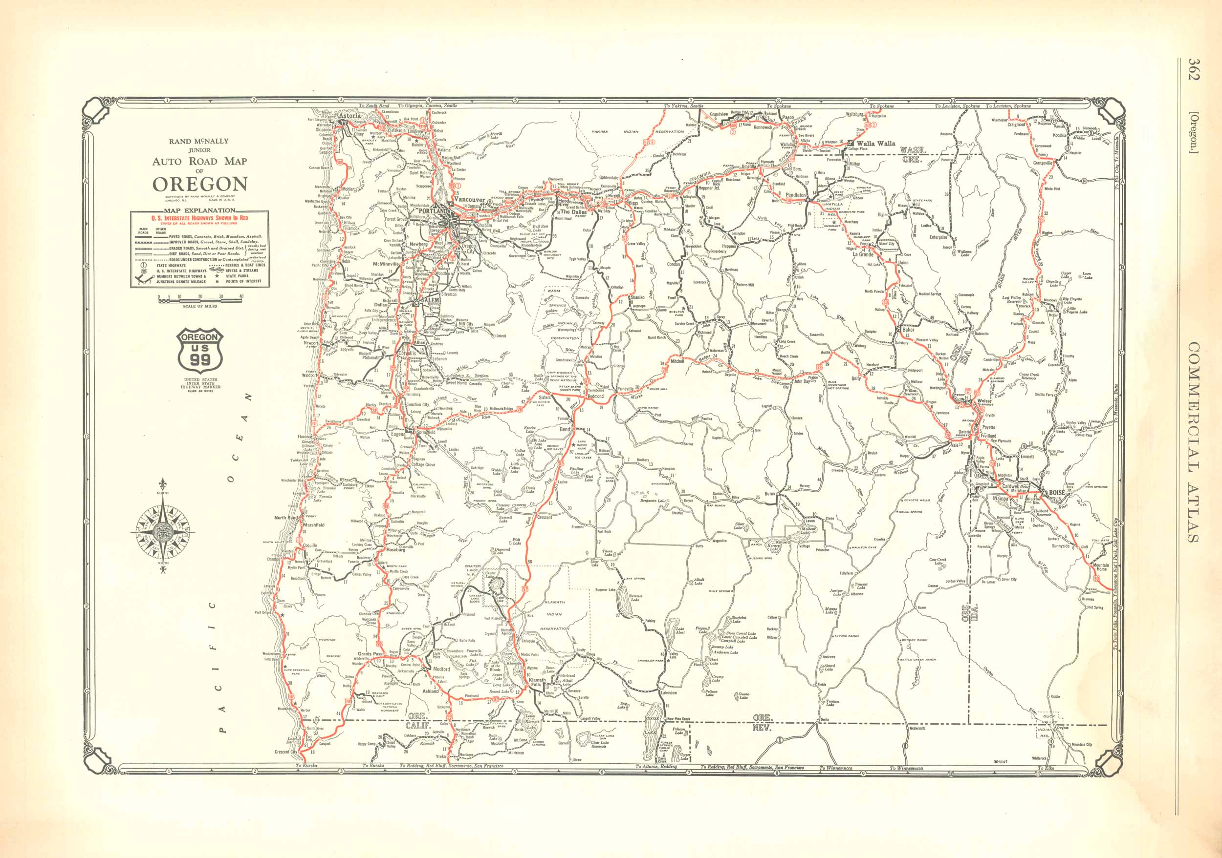 Rand McNally & Company, still a major name in map publishing to this day, began as a small print shop opened in Chicago in 1856 by William H. Rand. The shop originally printed guidebooks and directories. In 1858, Rand hired Andrew McNally who was later to become a partner. Within the next few years, the shop got into the railroad business by starting to print railway tickets and schedules, a key step in the development of the company. The ticket printing led to the publishing of railway guides, and by 1872 Rand McNally and Company had the capacity to publish maps. This map of Oregon came from Rand McNallys Commercial Atlas. A highly successful run of atlases that lasted over a decade. These maps were primarily used by business, because of their accurate listing of railroads in operation as well as tables of statistical information. This map is unique in several ways, their large format makes an impressive display, and offers additional room where many small towns and extra details are included. Additionally a list of every railroad operating in the state in 1932 is included. All railroad routes are shown on the map. This map includes all cities and towns, lakes, rivers, and bodies of water. All topographical features are also included as well as political features such as counties and Native American Indian reservations.