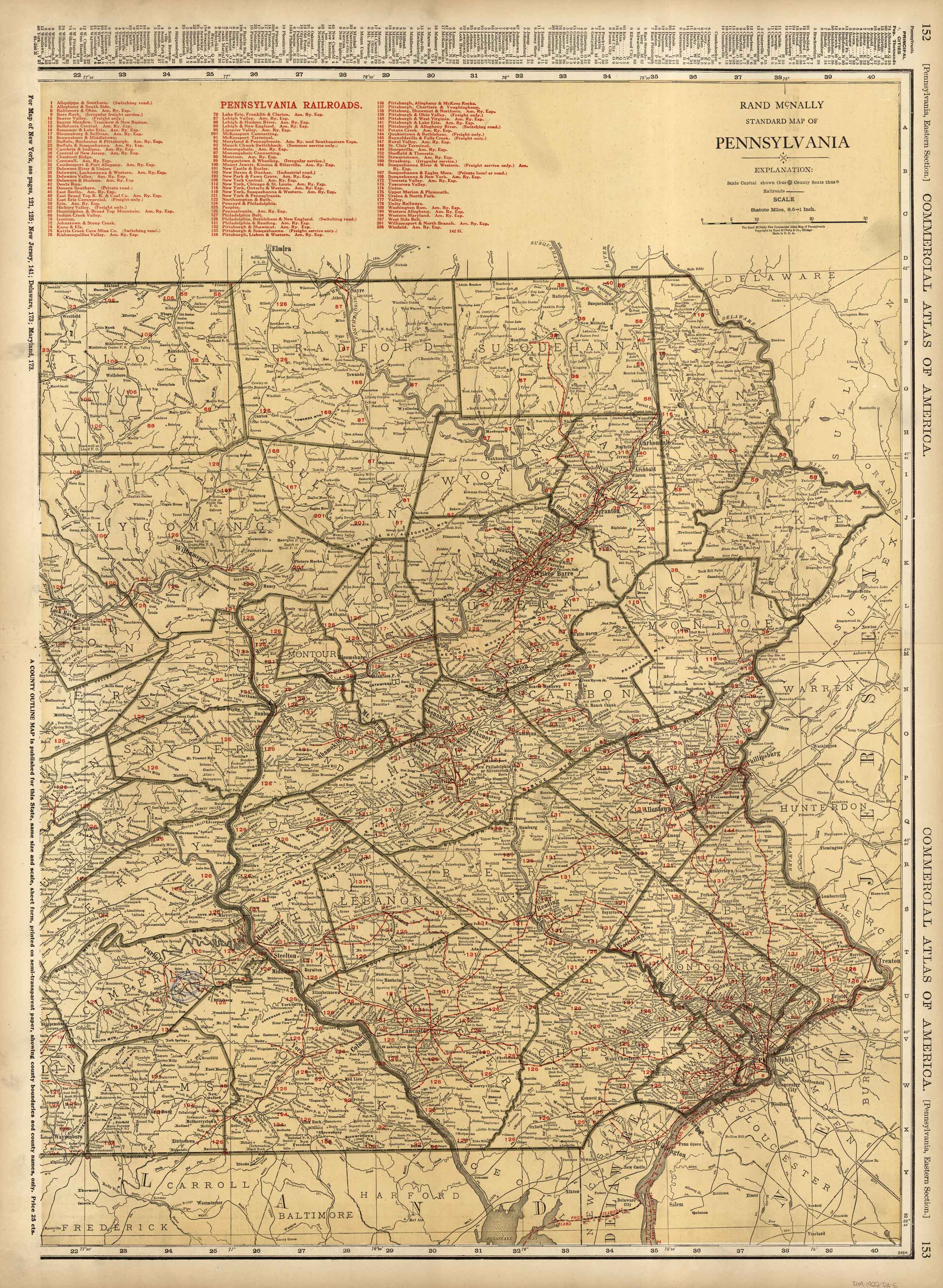 This map of Pennsylvania was produced by Rand McNally and Co. as part of its Commercial Atlas of America. The detail shown on each map is exceptional because of the map size. These maps were intended to be used by business for shipping, etc. Roads, railroads, and rivers are clearly shown. There is more detail on these maps than any others during this time period.