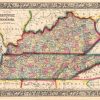 The Mitchell company was one of the first to try out the new technique of engraving on steel plates, experimenting with steel almost 20 years before the rest of the publishing industry. He was printing with steel in the early 1830s; the general switch to steel engraving was approximately 1850. During the early years of the company, Mitchell published mainly maps and travel guides. In 1860, Mitchell started producing “Mitchell’s New General Atlas”. Mitchell Sr. retired and turned the business over to his son of the same name. The New General Atlas was published until 1893. Today Mitchell maps are sought after for their fine engraving, bright coloring, and attention to detail. They are some of the finest maps produced in the 1860’s. This map, produced in 1863, shows Mitchell’s famous flower border, which is only seen in the early editions of his atlases. This map shows Kentucky and Tennessee.