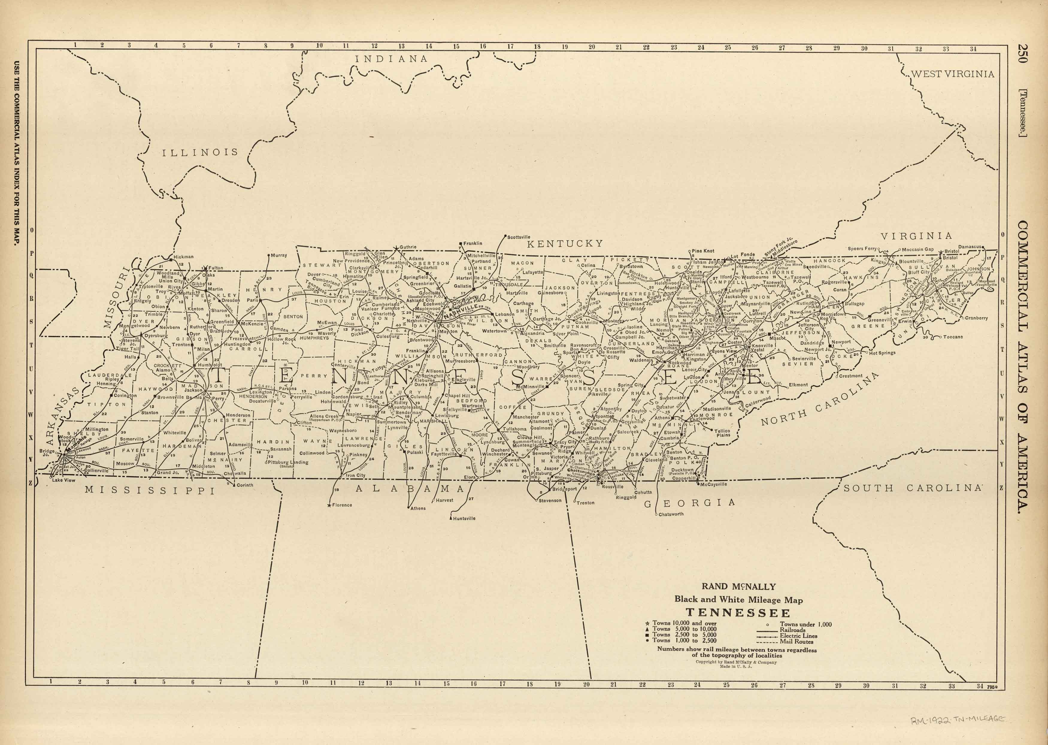 This map of Tennessee was produced by Rand McNally and Co. as part of its Commercial Atlas of America. The detail shown on each map is exceptional because of the map size. These maps were intended to be used by business for shipping, etc. Roads, railroads, and rivers are clearly shown. There is more detail on these maps than any others during this time period.