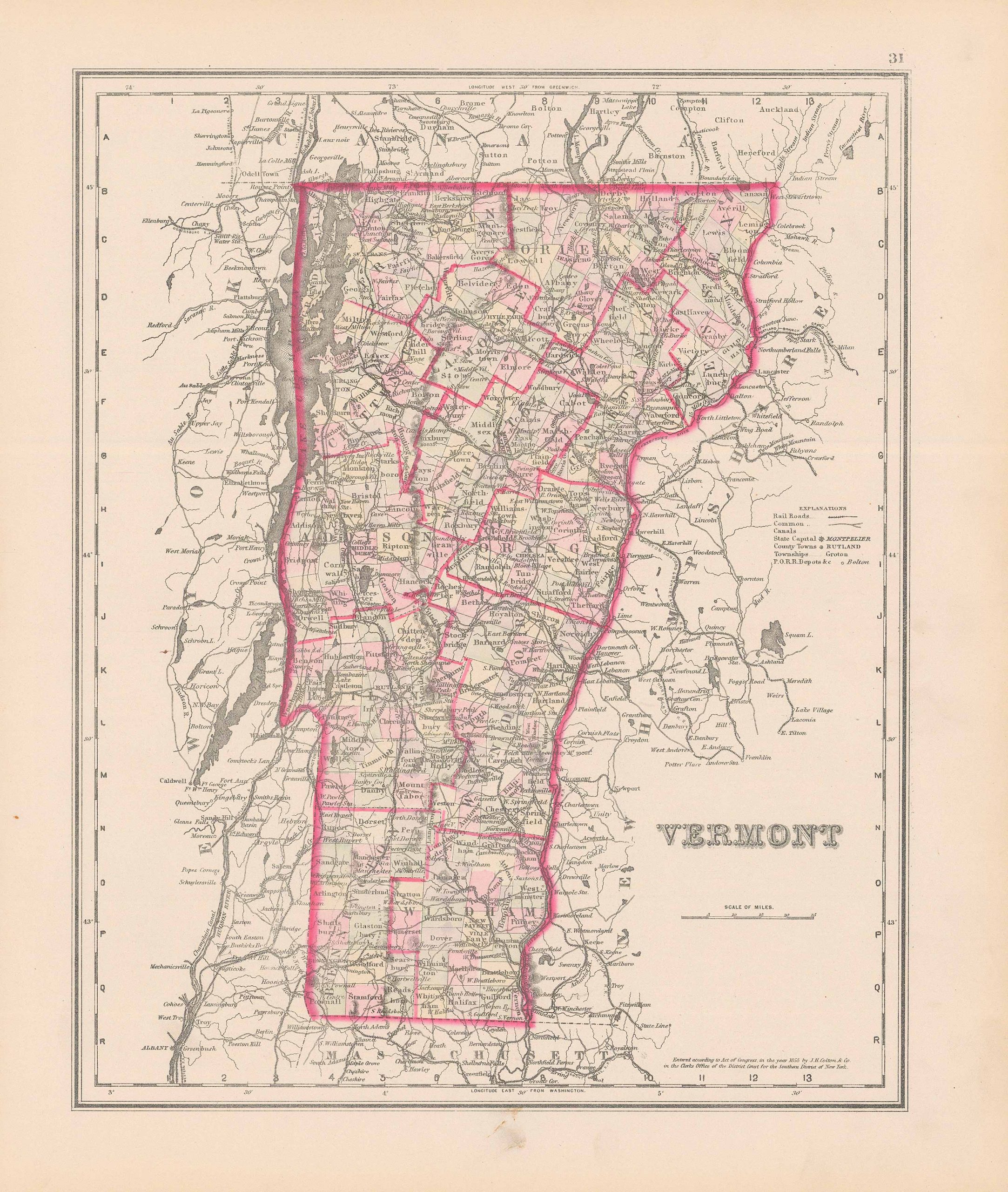 This antique map of Vermont was produced by O.W. Gray as part of his “National Atlas” in 1884. Gray was involved in the production of Atlas’ from ca. 1871 – 1886. We love his maps because of the wonderful hand coloring and attention to detail.