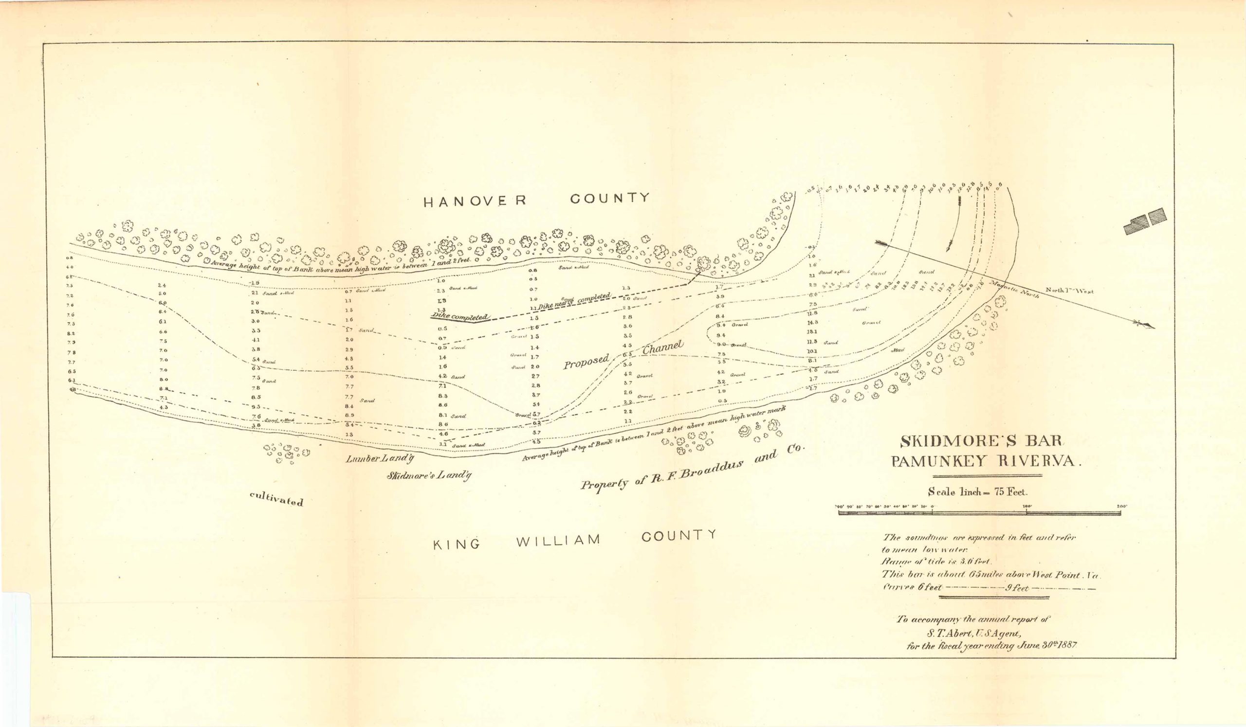 Skidmore’s Bar Pamunkey River, Virginia, to accompany the annual report of S.T. Albert, U.S. Agent, for the fiscal year ending June 30th 1887. This map includes King William County, Property of R.F. Broaddus and Co., Skidmore’s Landing, Lumber Landing, Hanover County, and the proposed channel.