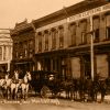 Store fronts and horse and carriages are pictured in this photo of 1200 Block of Pearl Street. The Boston Clothing House is shown, located at 1210 Pearl.