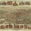 Panoramic city maps, popular at the turn of the century, depicted U.S. towns from the perspective that came to be known as bird’s-eye maps. These non-photographic old maps, depicted from oblique angles, showed street patterns, buildings and the predominant surrounding landscape in perspective. Going to great lengths to make these maps, artists would often climb surrounding hills or trees, sometimes even building platforms from which to achieve the bird’s eye” perspective. They also used to take rides in hot air balloons in order to get the proper perspective. To bolster sales of these old panoramic city maps, the artists would often choke town harbors full of ships, include proposed building developments and depict a vivacious, bustling industry. Historically interesting and beautifully drawn, it is no wonder these old panoramic city maps are making a popular comeback. Bring the spirit of your town’s history back to life with these stunning old bird’s-eye maps.”