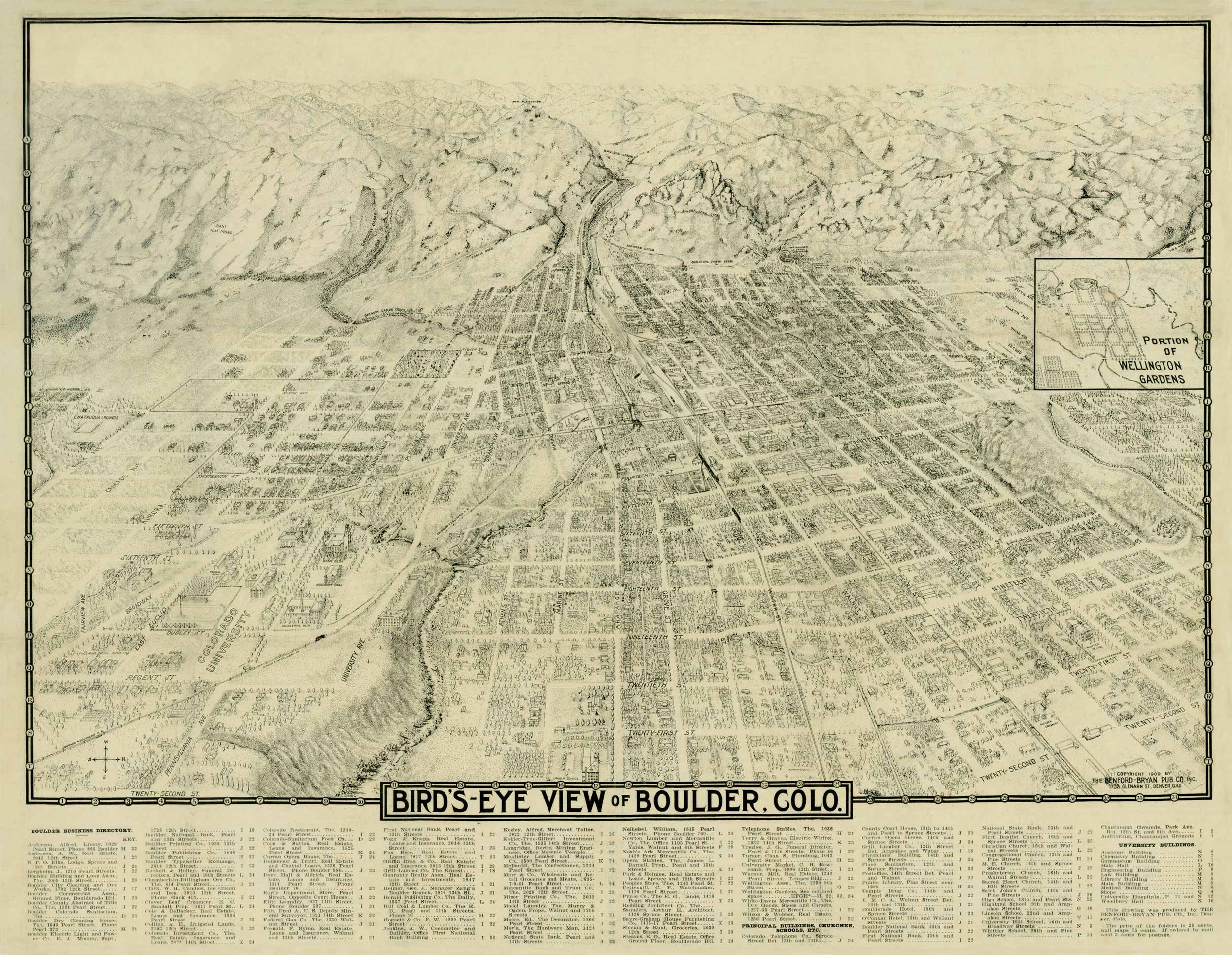This detailed map of Boulder, Colorado was printed by Benford-Bryan Pub. Co. in 1909. This map includes a directory of all the businesses housed in Boulder at the time of print, as well as the University of Colorado Boulder and each of its buildings at that time. Most streets are identified as well as the railroad which runs through the town, and recreational areas such as Chataqua Park and certain mountains and canyons across the foothills are included. There is an inset of a portion of the Wellington Gardens.