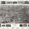 Panoramic city maps, popular at the turn of the century, depicted U.S. towns from the perspective that came to be known as bird’s-eye maps. These non-photographic old maps, depicted from oblique angles, showed street patterns, buildings and the predominant surrounding landscape in perspective. Going to great lengths to make these maps, artists would often climb surrounding hills or trees, sometimes even building platforms from which to achieve the bird’s eye” perspective. They also used to take rides in hot air balloons in order to get the proper perspective. To bolster sales of these old panoramic city maps, the artists would often choke town harbors full of ships, include proposed building developments and depict a vivacious, bustling industry. Historically interesting and beautifully drawn, it is no wonder these old panoramic city maps are making a popular comeback. Bring the spirit of your town’s history back to life with these stunning old bird’s-eye maps.”
