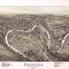 Panoramic city maps, popular at the turn of the century, depicted U.S. towns from the perspective that came to be known as bird’s-eye maps. These non-photographic old maps, depicted from oblique angles, showed street patterns, buildings and the predominant surrounding landscape in perspective. Going to great lengths to make these maps, artists would often climb surrounding hills or trees, sometimes even building platforms from which to achieve the bird’s eye” perspective. They also used to take rides in hot air balloons in order to get the proper perspective. To bolster sales of these old panoramic city maps, the artists would often choke town harbors full of ships, include proposed building developments and depict a vivacious, bustling industry. Historically interesting and beautifully drawn, it is no wonder these old panoramic city maps are making a popular comeback. Bring the spirit of your town’s history back to life with these stunning old bird’s-eye maps.”