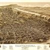 Panoramic city maps, popular at the turn of the century, depicted U.S. towns from the perspective that came to be known as bird’s-eye maps. These non-photographic old maps, depicted from oblique angles, showed street patterns, buildings and the predominant surrounding landscape in perspective. Going to great lengths to make these maps, artists would often climb surrounding hills or trees, sometimes even building platforms from which to achieve the bird’s eye” perspective. They also used to take rides in hot air balloons in order to get the proper perspective. To bolster sales of these old panoramic city maps, the artists would often choke town harbors full of ships, include proposed building developments and depict a vivacious, bustling industry. Historically interesting and beautifully drawn, it is no wonder these old panoramic city maps are making a popular comeback. Bring the spirit of your town’s history back to life with these stunning old bird’s-eye maps.”