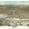 Panoramic city maps, popular at the turn of the century, depicted U.S. towns from the perspective that came to be known as bird’s-eye maps. These non-photographic old maps, depicted from oblique angles, showed street patterns, buildings and the predominant surrounding landscape in perspective. Going to great lengths to make these maps, artists would often climb surrounding hills or trees, sometimes even building platforms from which to achieve the bird’s eye” perspective. They also used to take rides in hot air balloons in order to get the proper perspective. To bolster sales of these old panoramic city maps, the artists would often choke town harbors full of ships, include proposed building developments and depict a vivacious, bustling industry. Historically interesting and beautifully drawn, it is no wonder these old panoramic city maps are making a popular comeback. Bring the spirit of your town’s history back to life with these stunning old bird’s-eye maps.”