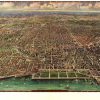 Panoramic city maps, popular at the turn of the century, depicted U.S. towns from the perspective that came to be known as bird’s-eye maps. These non-photographic old maps, depicted from oblique angles, showed street patterns, buildings and the predominant surrounding landscape in perspective. Going to great lengths to make these maps, artists would often climb surrounding hills or trees, sometimes even building platforms from which to achieve the bird’s eye” perspective. They also used to take rides in hot air balloons in order to get the proper perspective. To bolster sales of these old panoramic city maps, the artists would often choke town harbors full of ships, include proposed building developments and depict a vivacious, bustling industry. Historically interesting and beautifully drawn, it is no wonder these old panoramic city maps are making a popular comeback. Bring the spirit of your town’s history back to life with these stunning old bird’s-eye maps.”