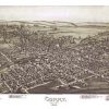 Panoramic city maps, popular at the turn of the century, depicted U.S. towns from the perspective that came to be known as bird’s-eye maps. These non-photographic old maps, depicted from oblique angles, showed street patterns, buildings and the predominant surrounding landscape in perspective. Going to great lengths to make these maps, artists would often climb surrounding hills or trees, sometimes even building platforms from which to achieve the bird’s eye” perspective. They also used to take rides in hot air balloons in order to get the proper perspective. To bolster sales of these old panoramic city maps, the artists would often choke town harbors full of ships, include proposed building developments and depict a vivacious, bustling industry. Historically interesting and beautifully drawn, it is no wonder these old panoramic city maps are making a popular comeback. Bring the spirit of your town’s history back to life with these stunning old bird’s-eye maps.”