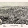 Panoramic city maps, popular at the turn of the century, depicted U.S. towns from the perspective that came to be known as bird’s-eye maps. These non-photographic old maps, depicted from oblique angles, showed street patterns, buildings and the predominant surrounding landscape in perspective. Going to great lengths to make these maps, artists would often climb surrounding hills or trees, sometimes even building platforms from which to achieve the bird’s eye” perspective. They also used to take rides in hot air balloons in order to get the proper perspective. To bolster sales of these old panoramic city maps, the artists would often choke town harbors full of ships, include proposed building developments and depict a vivacious, bustling industry. Historically interesting and beautifully drawn, it is no wonder these old panoramic city maps are making a popular comeback. Bring the spirit of your town’s history back to life with these stunning old bird’s-eye maps.”