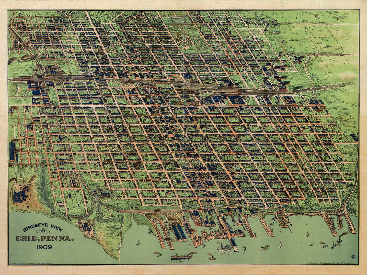 Panoramic city maps, popular at the turn of the century, depicted U.S. towns from the perspective that came to be known as bird’s-eye maps. These non-photographic old maps, depicted from oblique angles, showed street patterns, buildings and the predominant surrounding landscape in perspective. Going to great lengths to make these maps, artists would often climb surrounding hills or trees, sometimes even building platforms from which to achieve the bird’s eye” perspective. They also used to take rides in hot air balloons in order to get the proper perspective. To bolster sales of these old panoramic city maps, the artists would often choke town harbors full of ships, include proposed building developments and depict a vivacious, bustling industry. Historically interesting and beautifully drawn, it is no wonder these old panoramic city maps are making a popular comeback. Bring the spirit of your town’s history back to life with these stunning old bird’s-eye maps.”