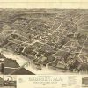 Panoramic city maps, popular at the turn of the century, depicted U.S. towns from the perspective that came to be known as bird’s-eye maps. These non-photographic old maps, depicted from oblique angles, showed street patterns, buildings and the predominant surrounding landscape in perspective. Going to great lengths to make these maps, artists would often climb surrounding hills or trees, sometimes even building platforms from which to achieve the bird’s eye” perspective. They also used to take rides in hot air balloons in order to get the proper perspective. To bolster sales of these old panoramic city maps, the artists would often choke town harbors full of ships, include proposed building developments and depict a vivacious, bustling industry. Historically interesting and beautifully drawn, it is no wonder these old panoramic city maps are making a popular comeback. Bring the spirit of your town’s history back to life with these stunning old bird’s-eye maps.”