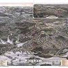 Panoramic city maps, popular at the turn of the century, depicted U.S. towns from the perspective that came to be known as bird’s-eye maps. These non-photographic old maps, depicted from oblique angles, showed street patterns, buildings and the predominant surrounding landscape in perspective. Going to great lengths to make these maps, artists would often climb surrounding hills or trees, sometimes even building platforms from which to achieve the bird’s eye” perspective. They also used to take rides in hot air balloons in order to get the proper perspective. To bolster sales of these old panoramic city maps, the artists would often choke town harbors full of ships, include proposed building developments and depict a vivacious, bustling industry. Historically interesting and beautifully drawn, it is no wonder these old panoramic city maps are making a popular comeback. Bring the spirit of your town’s history back to life with these stunning old bird’s-eye maps.”