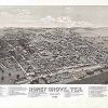 Panoramic city maps, popular at the turn of the century, depicted U.S. towns from the perspective that came to be known as bird’s-eye maps. These non-photographic old maps, depicted from oblique angles, showed street patterns, buildings and the predominant surrounding landscape in perspective. Going to great lengths to make these maps, artists would often climb surrounding hills or trees, sometimes even building platforms from which to achieve the bird’s eye” perspective. They also used to take rides in hot air balloons in order to get the proper perspective. To bolster sales of these old panoramic city maps, the artists would often choke town harbors full of ships, include proposed building developments and depict a vivacious, bustling industry. Historically interesting and beautifully drawn, it is no wonder these old panoramic city maps are making a popular comeback. Bring the spirit of your town’s history back to life with these stunning old bird’s-eye maps.”