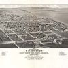 Panoramic city maps, popular at the turn of the century, depicted U.S. towns from the perspective that came to be known as bird’s-eye maps. These non-photographic old maps, depicted from oblique angles, showed street patterns, buildings and the predominant surrounding landscape in perspective. Going to great lengths to make these maps, artists would often climb surrounding hills or trees, sometimes even building platforms from which to achieve the bird’s eye” perspective. They also used to take rides in hot air balloons in order to get the proper perspective. To bolster sales of these old panoramic city maps, the artists would often choke town harbors full of ships, include proposed building developments and depict a vivacious, bustling industry. Historically interesting and beautifully drawn, it is no wonder these old panoramic city maps are making a popular comeback. Bring the spirit of your town’s history back to life with these stunning old bird’s-eye maps.”