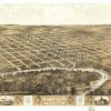 Panoramic city maps, popular at the turn of the century, depicted U.S. towns from the perspective that came to be known as bird’s-eye maps. These non-photographic old maps, depicted from oblique angles, showed street patterns, buildings and the predominant surrounding landscape in perspective. Going to great lengths to make these maps, artists would often climb surrounding hills or trees, sometimes even building platforms from which to achieve the bird’s eye” perspective. They also used to take rides in hot air balloons in order to get the proper perspective. To bolster sales of these old panoramic city maps, the artists would often choke town harbors full of ships, include proposed building developments and depict a vivacious, bustling industry. Historically interesting and beautifully drawn, it is no wonder these old panoramic city maps are making a popular comeback. Bring the spirit of your town’s history back to life with these stunning old bird’s-eye maps.”